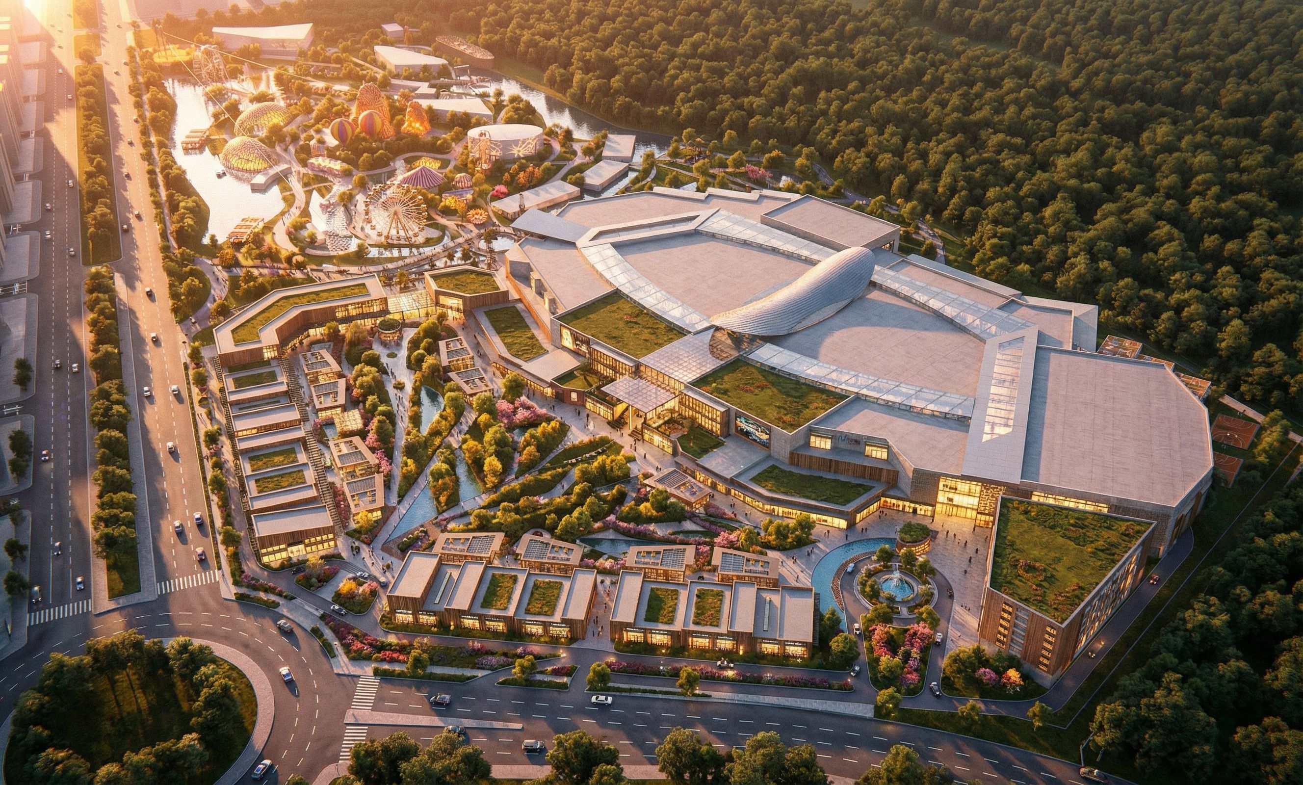 PromptPhoto of a modern mixed-use development featuring a dynamic building with a distinctive roofline and expansive glass facades. Surrounding elements include landscaped gardens, winding pathways, and curated green spaces, emphasizing sustainability. The urban setting showcases nearby retail spaces and recreational areas. Natural lighting highlights the textures of diverse materials, casting intriguing shadows during golden hour. Captured from a high-angle perspective, the framing accentuates the building's architectural features, utilizing a wide-angle lens to emphasize the surrounding environment., keep exact camera angle