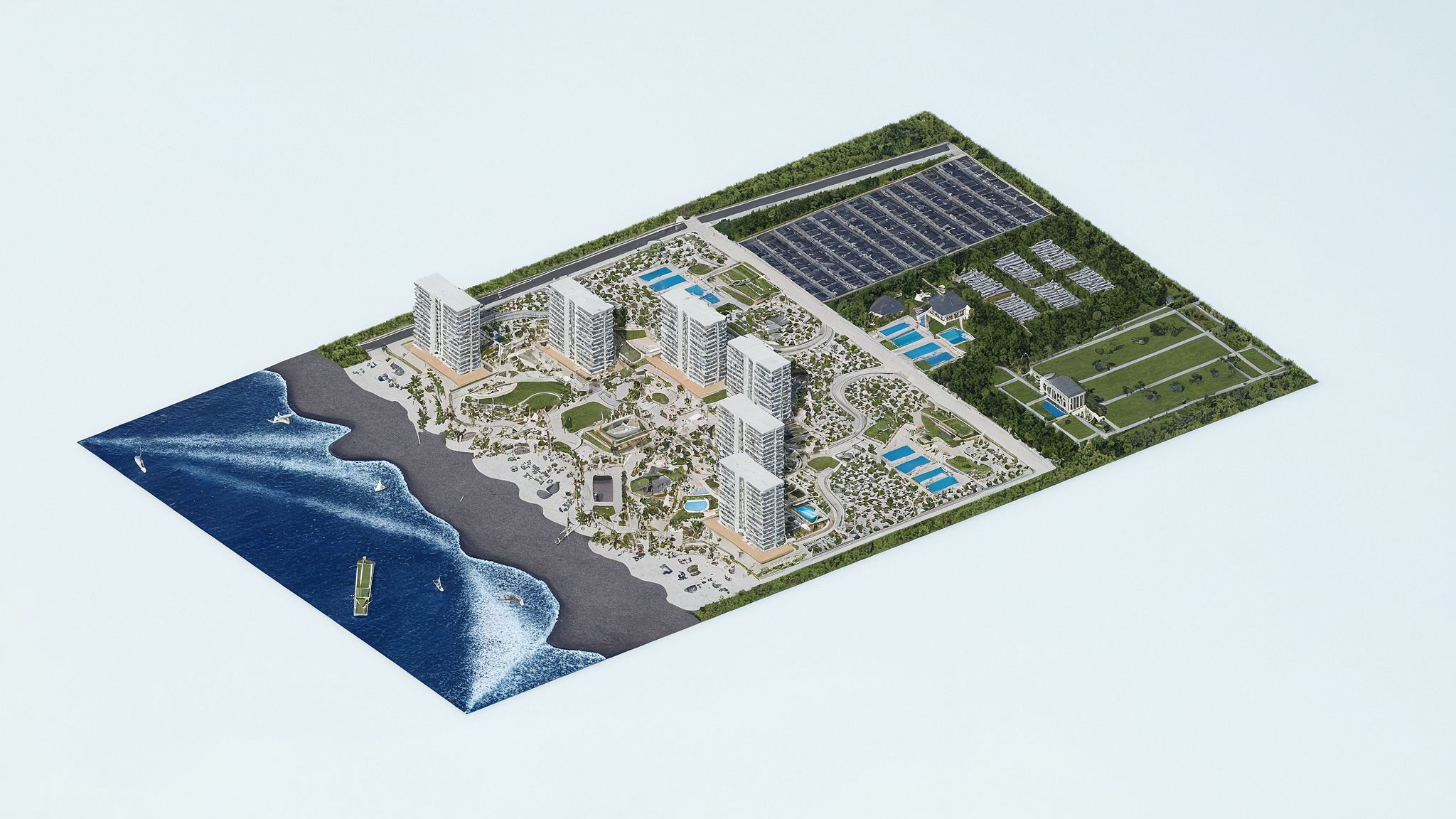 Photo of a modern residential complex featuring multiple high-rise buildings. Architectural details include textured facades with glass elements and balconies, wood and surrounded by lush landscaping and a swimming pool. The scene is set in an urban environment near a coastline, with boats on the water, football fields, concerts venue y a parking lot and a beach club. Natural daylight enhances the vibrant colors, casting soft shadows. Captured from a high-angle perspective with a wide lens, showcasing the layout and integration into the landscape, emphasizing the harmonious blend of architecture and nature.