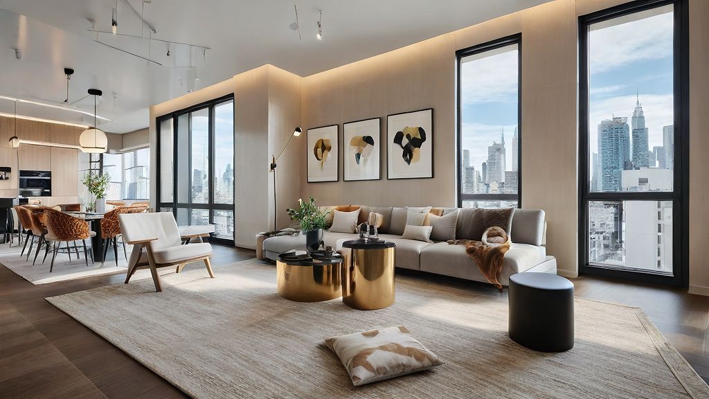 PromptPhoto of a modern apartment interior featuring an open-concept living space. Emphasize the sleek furnishings, including a minimalist sofa, designer chairs, and unique side tables, with a focus on textures like soft fabrics and polished surfaces. The layout provides views through expansive windows showcasing a vibrant urban skyline. Natural daylight floods the room, creating gentle shadows. Capture the scene from a corner perspective, highlighting the contrast between the warm tones of the décor and the cool cityscape outside, with a wide-angle lens to enhance the spacious feel.