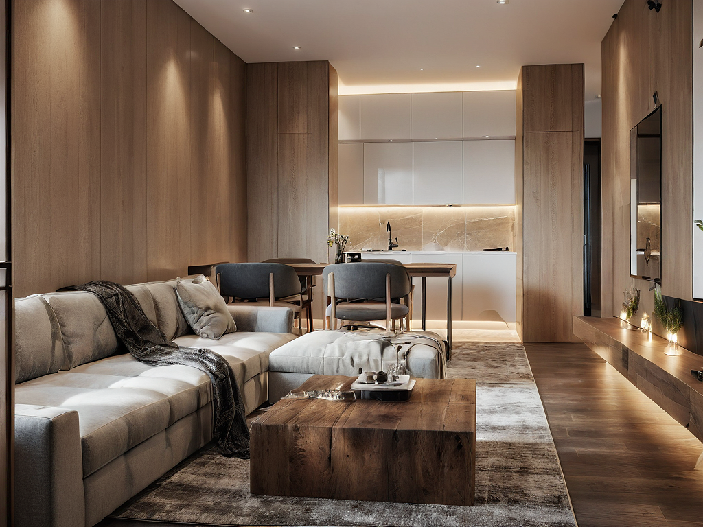 Prompt1.Put a carpet under the short table which matches with this interior 2. Light up all space with lights