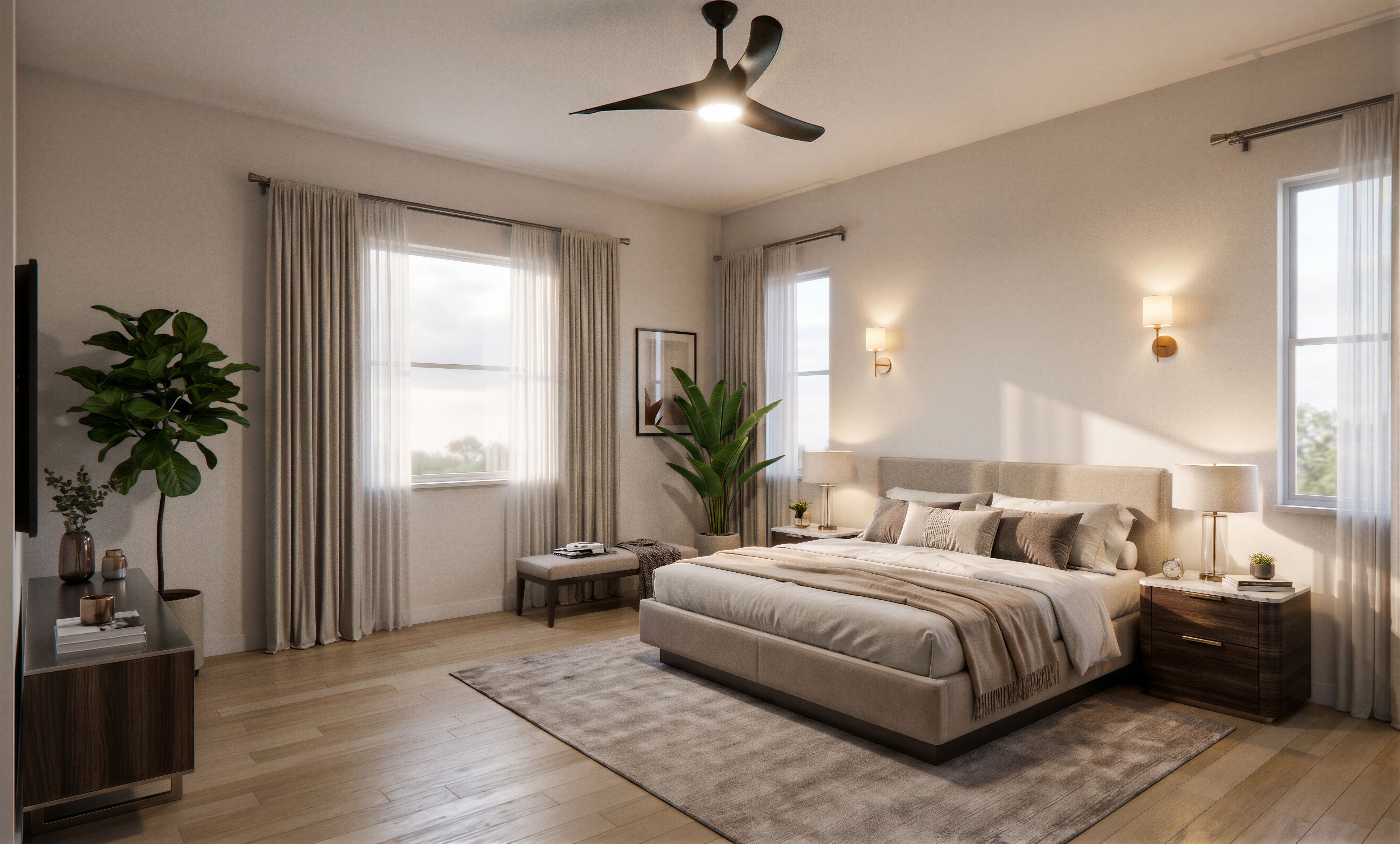 EnhancedPromptMake photorealistic renderings of the master bedroom; Replace bed and end tables with something elegant and luxury looking; Add light fixtures, curtains, furniture, interior plants and other miscellaneous items where appropriate; TV on the left as shown, add TV console below the existing TV; Light fixtures are on, bright room; Elegant and luxury look; Only skies and top of trees is seeing through the windows, blur and washed out the view slightly;, keep exact camera angle