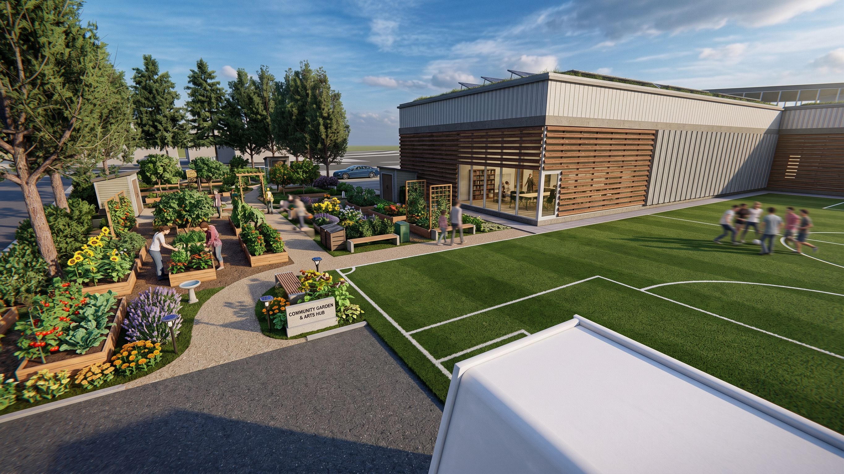 MAKE THIS A COMMUNITY GARDEN ADD MATERIALS TO THE SOCCER FIELD AND THE BUILDING DONT CHANGE OR ADD KEEP THE SAME ASPECT OF THE VIEW DELELE THE LUMION LOGO DONT CHANGE THE FACADE, keep exact camera angle