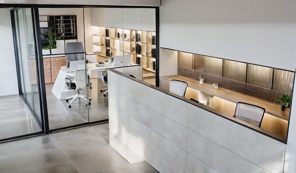 Photo of a modern office interior featuring transparent glass walls and sleek workstations. Highlight the contrast between the smooth, light-colored surfaces and textured stone partition. Surrounding elements include minimalist furniture and organized shelving units filled with documents. Natural light streams in, casting soft shadows and illuminating the workspace. Capture from a high-angle perspective, using a wide-angle lens to emphasize depth and spatial arrangement, showcasing the open and airy atmosphere.