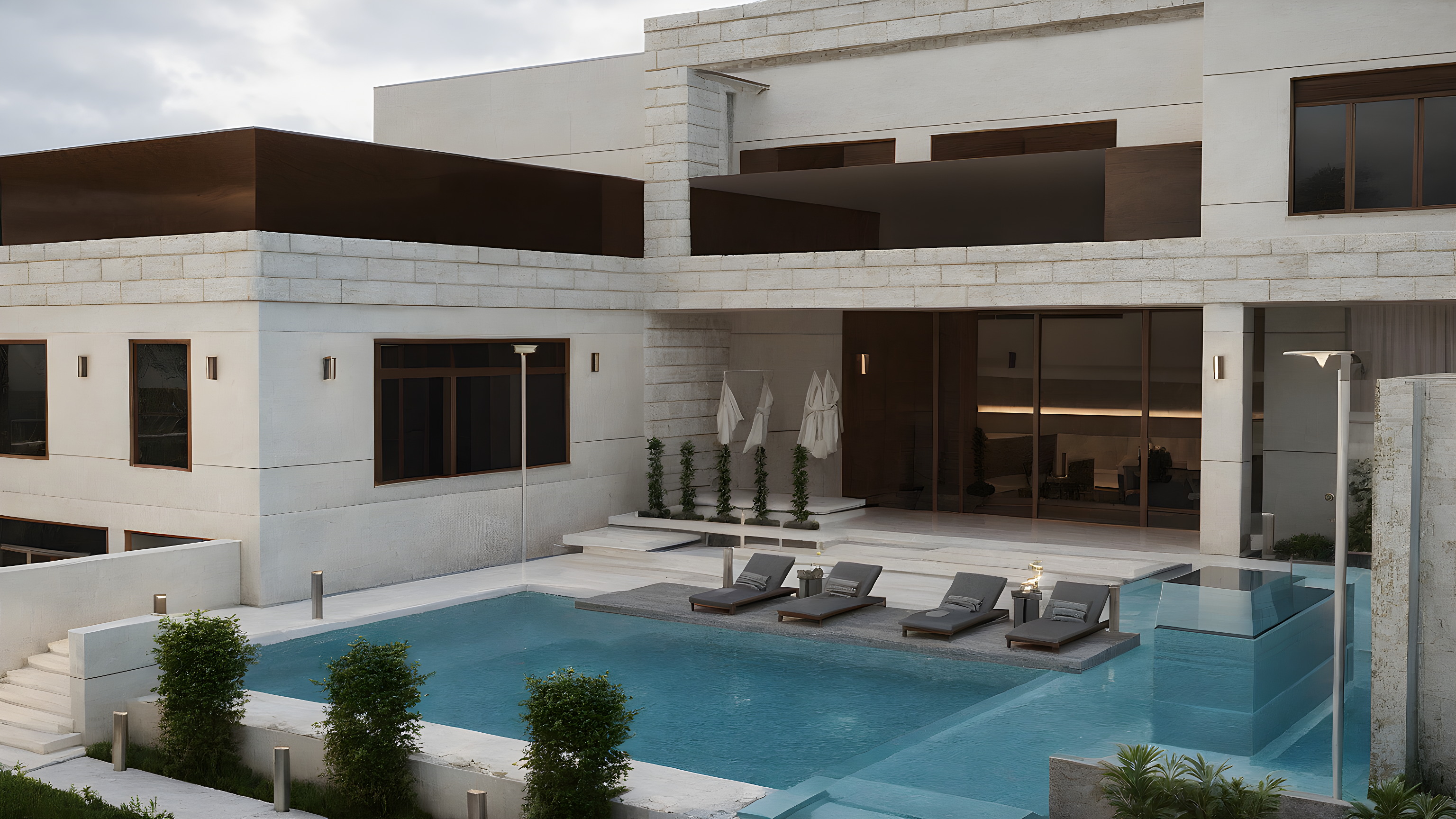 Promptswimming pool fromblue tiles stair and ground from atiles lock like white and stone make it the same photo "Enhance an ultra-realistic exterior image using AI while strictly preserving the original design, lines, and composition without any distortions or alterations. Improve global illumination, refine sunlight direction, and enhance atmospheric depth. Perfect reflections on glass and water, refine displacement for detailed textures, and ensure physically accurate lighting. Maintain precise alignment of all elements, correct any imperfections, and enhance materials for a natural, high-quality finish. Optimize foliage realism, water clarity, and overall contrast while keeping the original structure and design intact."