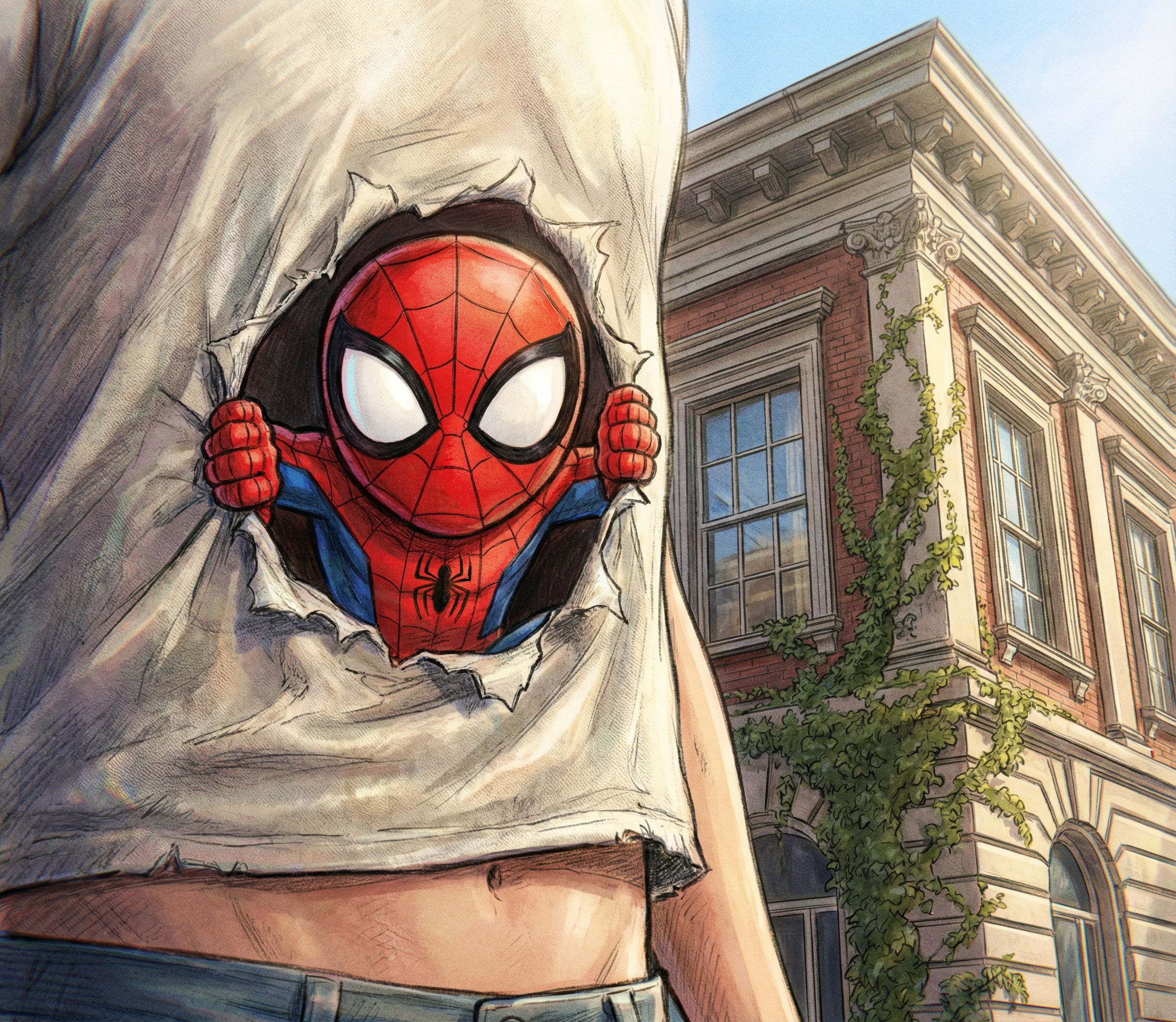 PromptCreate an image with the attached Spidey image. Create an image with this Spidey peeking through a hole in a shirt worn on his stomach., keep exact camera angle