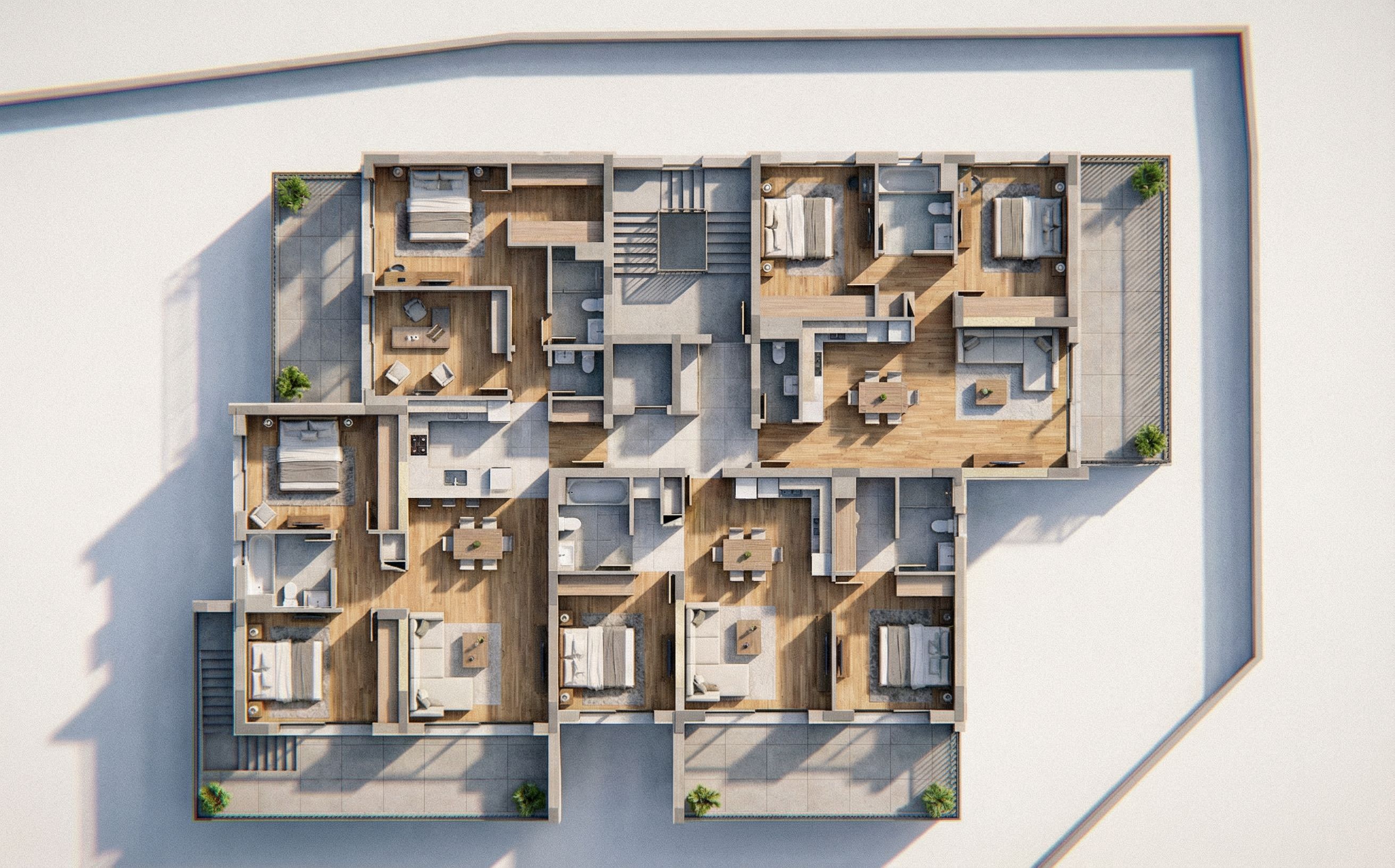 Remove all architectural lines, dimensions and text, keep exact camera angle