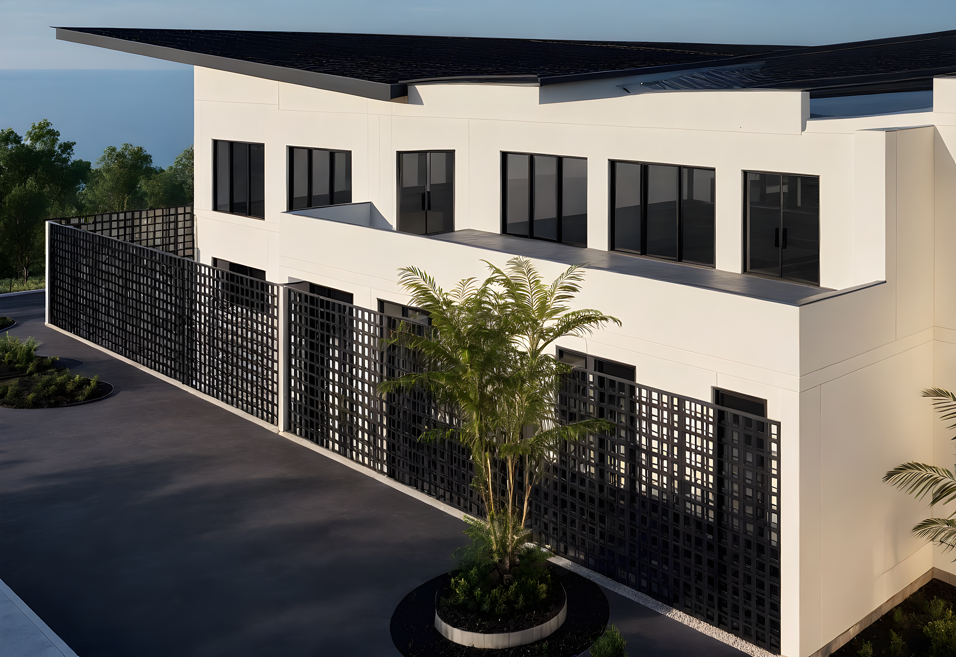 Promptkeep the structural and architectural exterior design of the community center, it has an exterior lattice walls as a high fence with a predominant material concret and a metaldeck roof color black