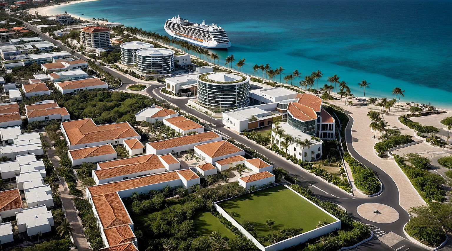 PromptPhoto of a contemporary mixed-use urban development, showcasing dynamic geometric shapes and varied materials, neutral colors. Located in Aruba. Surrounding features include landscaped green spaces,more vegetation, less pavement a prominent cruise ship, and vibrant pathways connecting different zones. The scene is illuminated by soft afternoon sunlight, casting gentle shadows and highlights on the building facades. From a slightly elevated angle, the framing captures the interplay between architecture and nature while emphasizing foreground details like trees and walkways, enhancing the sense of depth and scale. Horizon in land