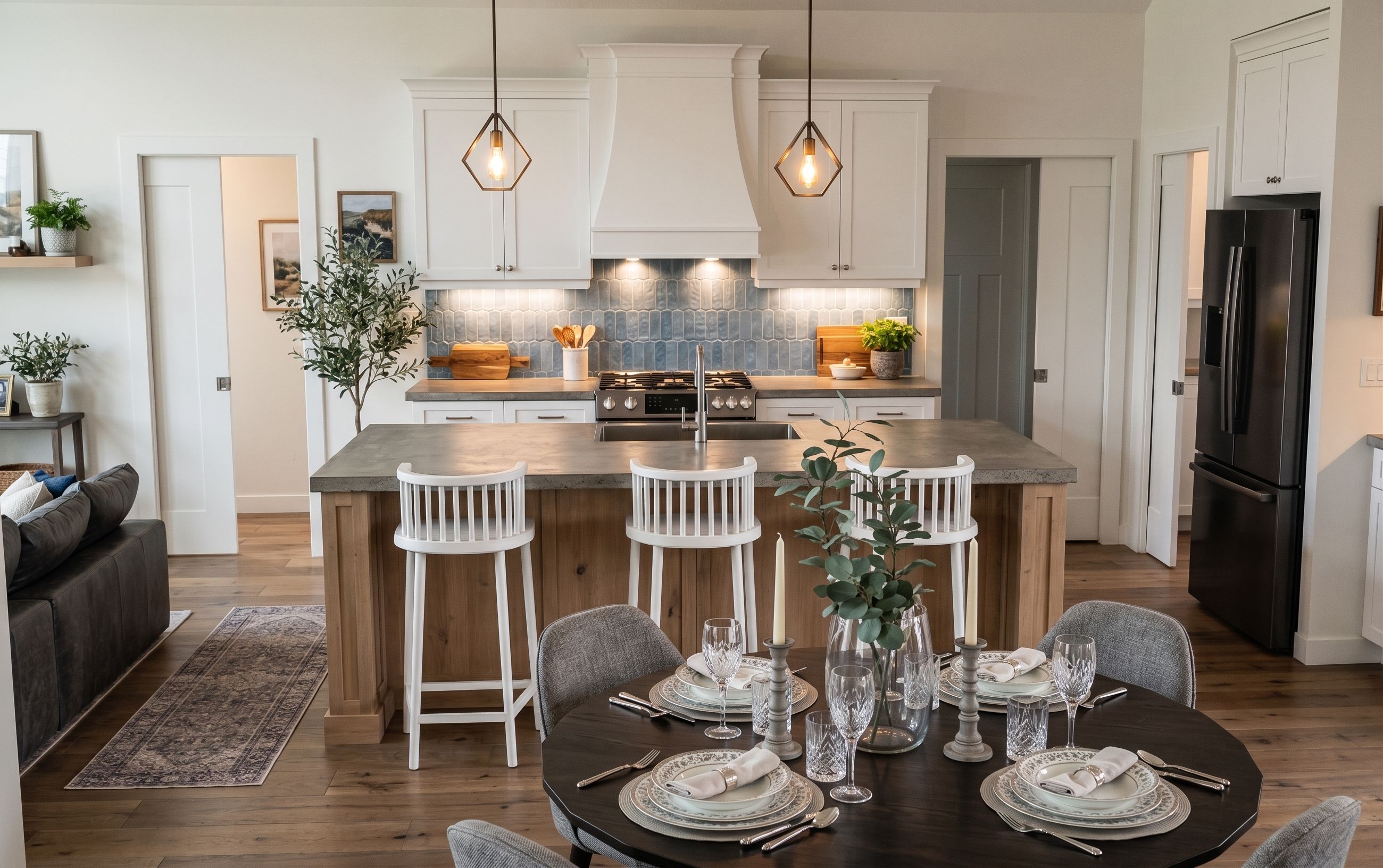 PromptPhoto of a modern kitchen interior showcasing a spacious open layout. Highlight the sleek cabinetry with a mix of matte and glossy finishes, the textured blue backsplash, and polished countertops. Emphasize the contemporary dining area adorned with elegant table settings, including fine china and glassware. Urban setting integrated with natural wood flooring and subtle plant accents. Soft, ambient lighting from overhead fixtures creates inviting shadows, contrasting with warm tones. Camera angle captures a dynamic perspective, focusing on the kitchen island's details and the dining atmosphere for an immersive experience. white pocket door to hallway on the left and white pocket door to mudroom on the right, have all lights turned on, under valance lights, stove lights, white range hood cover, wall art, plants, keep exact camera angle