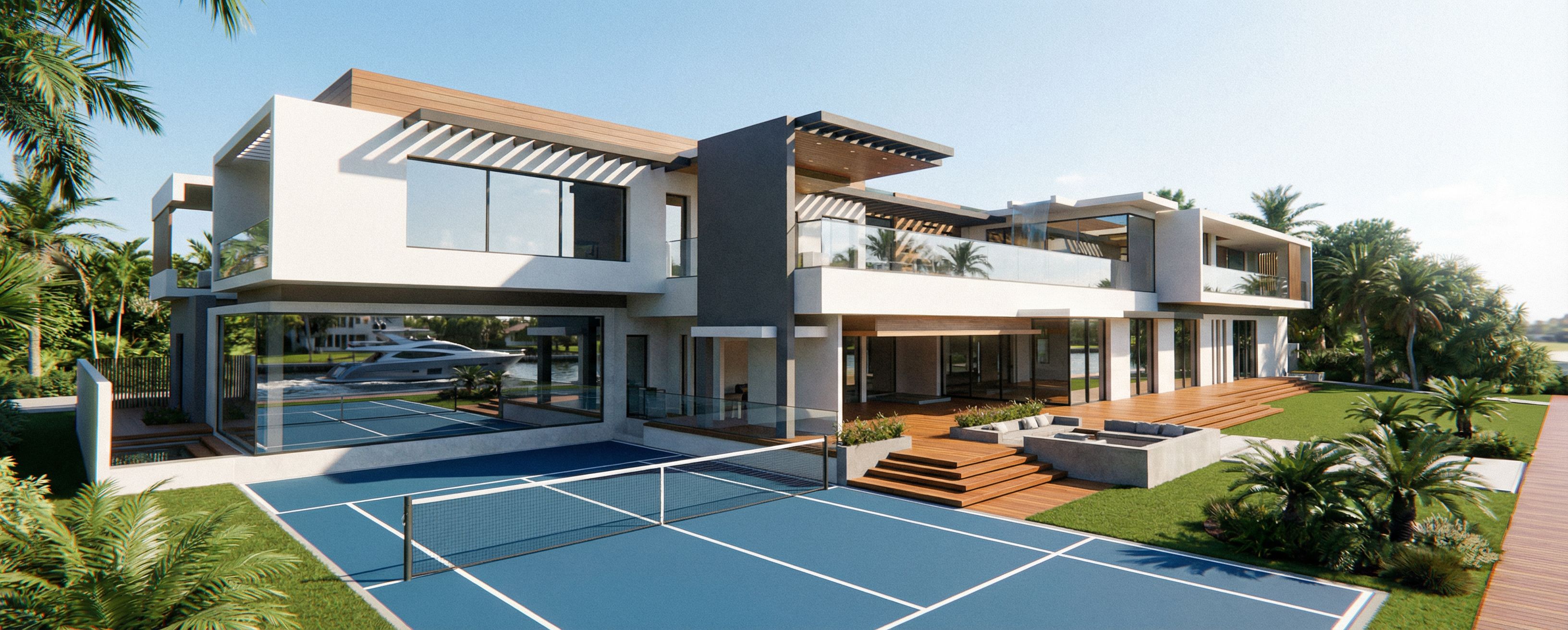 RENDER HYPER REALISTA. CASA MODERNA. VEGETACION TIPICA DE LA FLORIDA. TODOS LOS VIDRIOS LOW E CLEAR. LOS PISOS DE MADERA EN TONO DECK COMO EL DE LOS YATES. EN EL VIDRIO ATRAS DE LA CANCHA REFLEJAR UN YATE PASANDO EN UN CANAL. , keep exact camera angle
