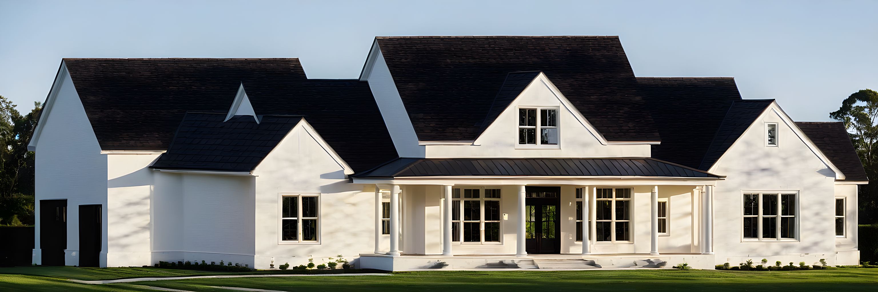 daytime. interior lighting on. window sash and frames white. manicured lawn with mature boxwood landscaping. treeline behind. painted white brick exterior with painted white brick foundation. Front doors dark wood.