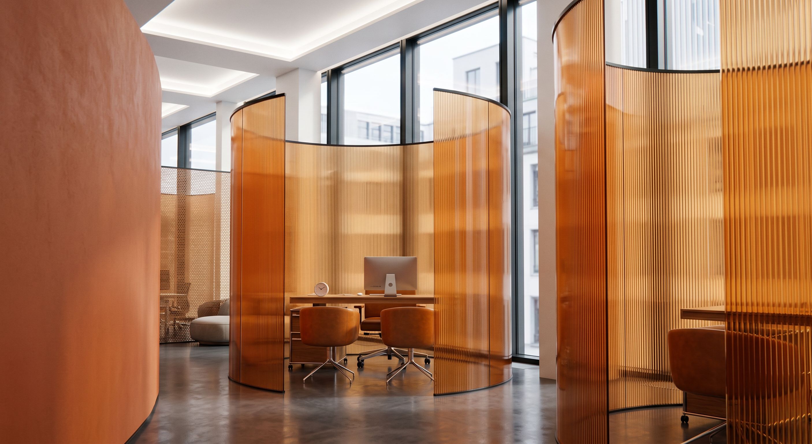 PromptInterior architectural photography, focused on a curved wall made of amber-orange fluted glass, vertical ribbed texture, translucent effect with soft blurry silhouettes behind. Grey microcement floor with satin reflections. High-end Swiss minimalist design, clean white ceiling, bright studio lighting, cinematic atmosphere, 8k, realistic glass refractions., keep exact camera angle