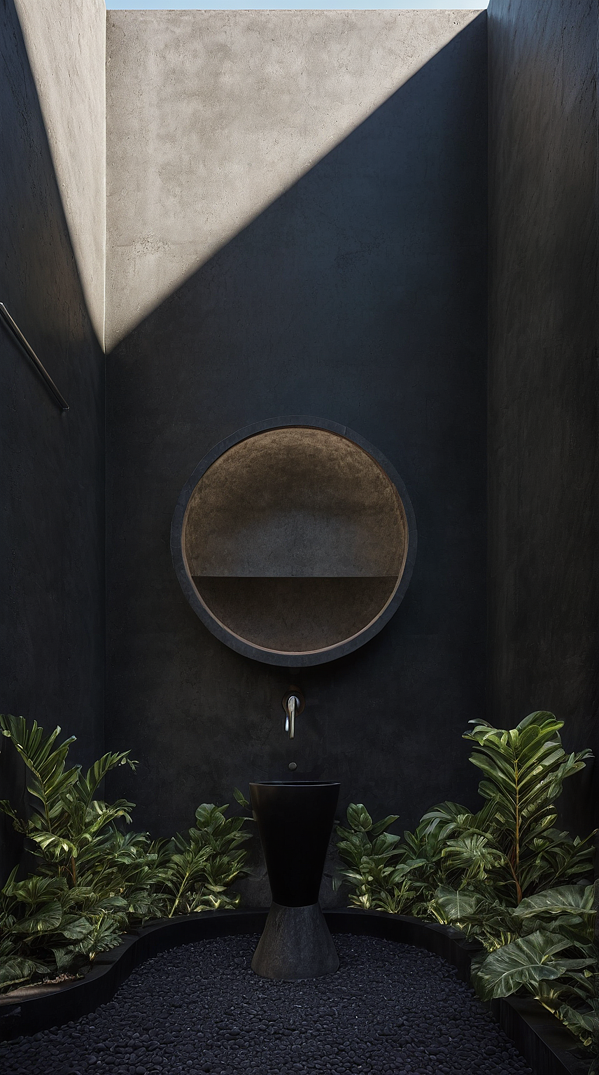 a detailed photo of a black concrete sink on an outdoor bathroom