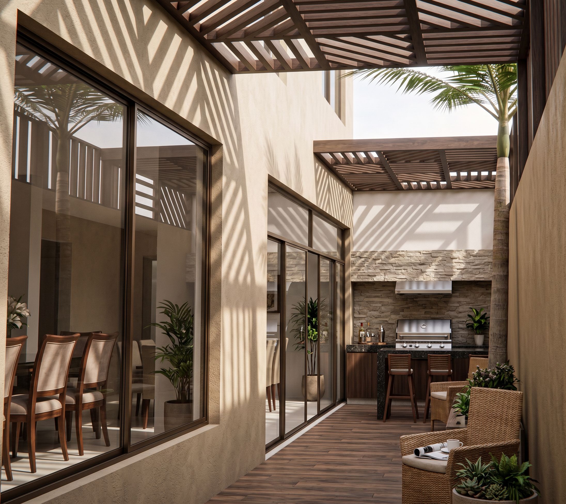 PromptPhoto of a contemporary outdoor living space with large glass sliding doors, wooden flooring, and a woven chair. The architectural design features sleek lines and a modern roof structure, complemented with greenery. Enclosed with high walls around, in sand color, a bar with a granite countertop, and in the background a back bar with a grill. Natural light floods the space, casting soft shadows across the patio. Captured from a low-angle perspective, highlighting the interaction of elements and textures, showing the cozy atmosphere. Wood-look flooring