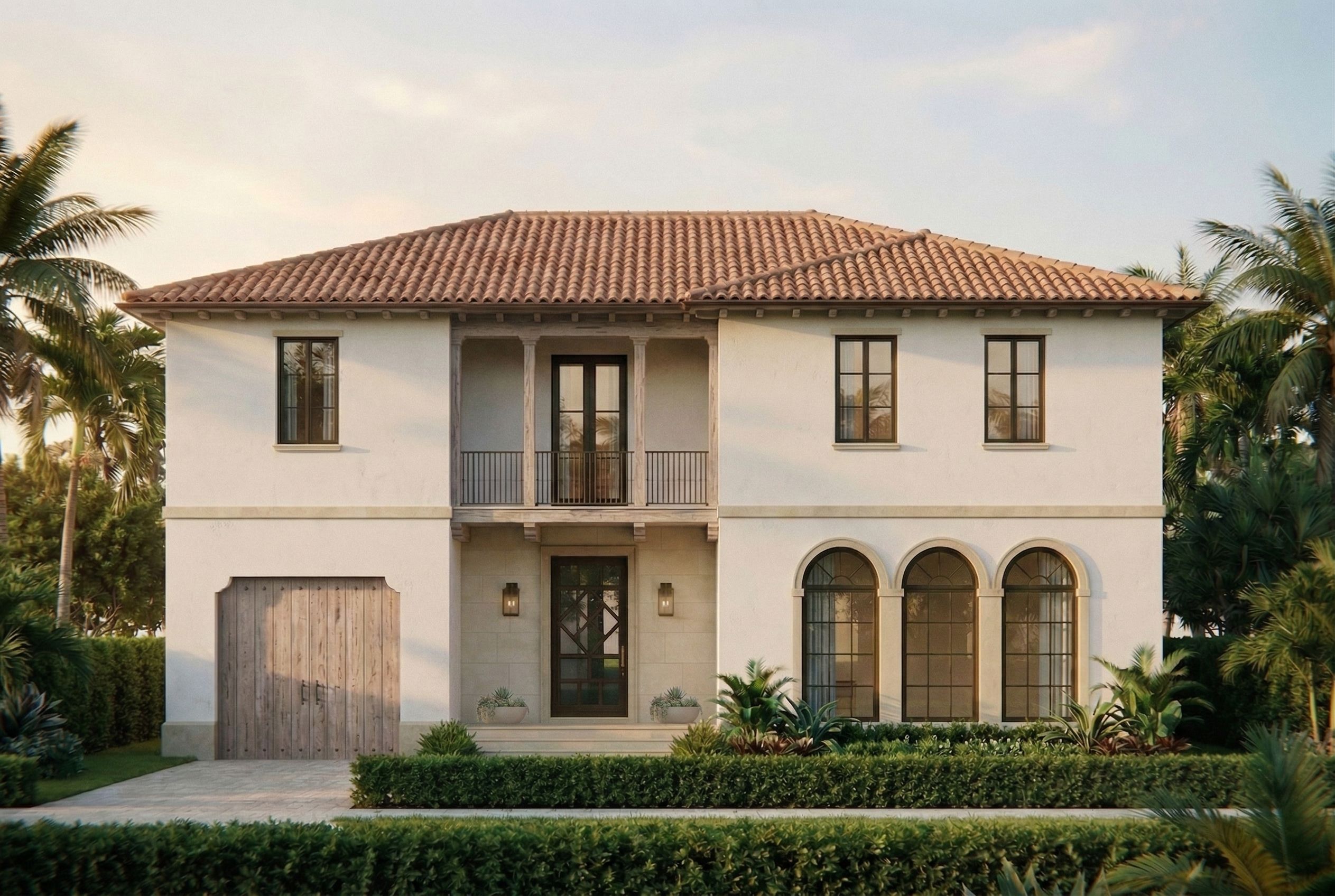 PromptEnhance this image to be ultra-photorealistic while keeping the architecture EXACTLY the same. Do NOT change, move, add, or remove anything. Do NOT alter massing, proportions, openings, rooflines, railings, landscaping layout, or camera view. Do NOT crop or zoom. This is a strict material and lighting enhancement only. MATERIALS: Wood (garage door + balcony): lime-washed pecky cypress soft, neutral tone natural grain and pecky texture subtle tonal variation (not flat or chalky) matte, weathered, high-end finish absolutely NO orange or overly warm tones Cast stone (window surrounds, arches, horizontal band, trim, and entry surround): refined, dense, honed finish slightly warmer or cooler than stucco but clearly distinct smooth with very minimal joints elegant, high-end limestone-like appearance must read as a separate material from stucco (not blended) Stucco (main body): smooth, high-end, warm off-white subtle natural variation, not perfectly flat LIGHTING + DEPTH (CRITICAL): Use soft, natural daylight with slight directional sun (NOT flat, NOT overcast, NOT golden hour). The façade should be bright and well lit, but with clear shadow definition Add shadow depth under roof overhangs and rafters Add shadows at all window and door recesses Columns and balcony structure must cast subtle directional shadows Arched windows must show depth with gradient shadow inside the arches Increase ambient occlusion at all material transitions for realism Maintain a clean, elegant look but avoid flat lighting — prioritize depth and dimension REALISM: Accurate material reflectivity: matte stucco slightly smoother cast stone natural wood variation Glass should have soft reflections with slightly dark interiors Interior lighting can be present but not clearly visible or distracting GOAL: A high-end, photorealistic “money shot” render with refined materials, clear depth, and natural shadow — while preserving the exact original architecture with zero changes., keep exact camera angle