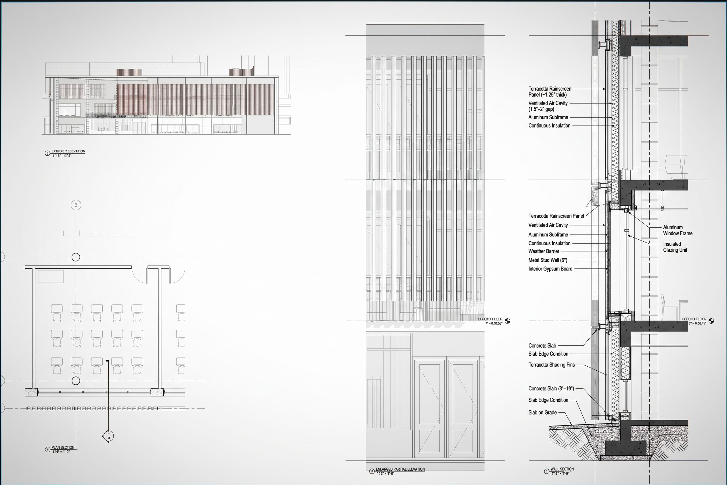 Enhance this architectural wall section sheet while keeping the EXACT layout, drawing positions, and composition unchanged. DO NOT move, resize, or redesign any drawings on the sheet. Only refine linework, add material layers, thickness, and detailed annotations. -------------------------------------------------- WALL ASSEMBLY OUTSIDE TO INSIDE — MUST BE CLEARLY DRAWN WITH THICKNESS: - Terracotta rainscreen panel ~1.25" thick, outermost layer - Ventilated air cavity 1.5"–2" gap, left empty - Aluminum rail / subframing system thin vertical supports - Continuous rigid insulation 2"–4", light hatch - Weather-resistive barrier thin line - Metal stud wall 6", with batt insulation hatch - Interior gypsum board 5/8", thin layer Ensure each layer is graphically distinct and readable. -------------------------------------------------- STRUCTURAL INTEGRATION: - Show concrete slab thickness 8"–10" - Show slab edge condition connecting to wall - Add drop panel if near column - Columns if visible should be darker poche -------------------------------------------------- FOUNDATION / GROUND CONDITION: - Show slab on grade condition - Add compacted base below slab - Indicate foundation or footing below - Add insulation at slab edge if visible -------------------------------------------------- WINDOW DETAIL VERY IMPORTANT: - Add recessed aluminum window frame within wall assembly - Show insulated glazing unit double line - Indicate head and sill condition - Show how window sits within insulation layer -------------------------------------------------- SHADING SYSTEM: - Add terracotta vertical shading fins offset from facade ~1'–2" - Include thin steel or aluminum support bracket - Keep aligned with facade system -------------------------------------------------- GRAPHIC STYLE: - Strong poche for cut elements slab, wall, column - Thin lines for background elements - Clean architectural detail drawing black + white - Minimal gray hatching for materials - No color rendering -------------------------------------------------- ANNOTATION CLEAN + PROFESSIONAL: Add labels with leader lines: - Terracotta Rainscreen Panel - Ventilated Air Cavity - Aluminum Subframe - Continuous Insulation - Weather Barrier - Metal Stud Wall 6" - Interior Gypsum Board - Concrete Slab - Slab Edge Condition - Slab on Grade - Aluminum Window Frame - Insulated Glazing Unit - Terracotta Shading Fins -------------------------------------------------- IMPORTANT: - DO NOT simplify the wall - DO NOT leave layers ambiguous - DO NOT over-render - Keep clarity and hierarchy - Make it read like a real construction detail, keep exact camera angle