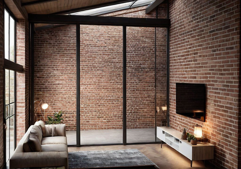 living room. bricks, windows glass,