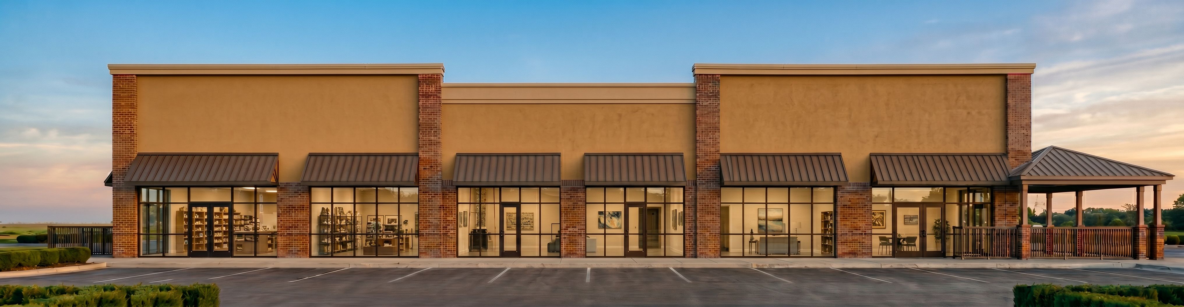 PromptMake the color of EIFS above the glass storefronts and below the roof coping a bit darker tan. Remove the horizontal black boxes/lines that run through the stoerefront glass. Do not change anything else., keep exact camera angle