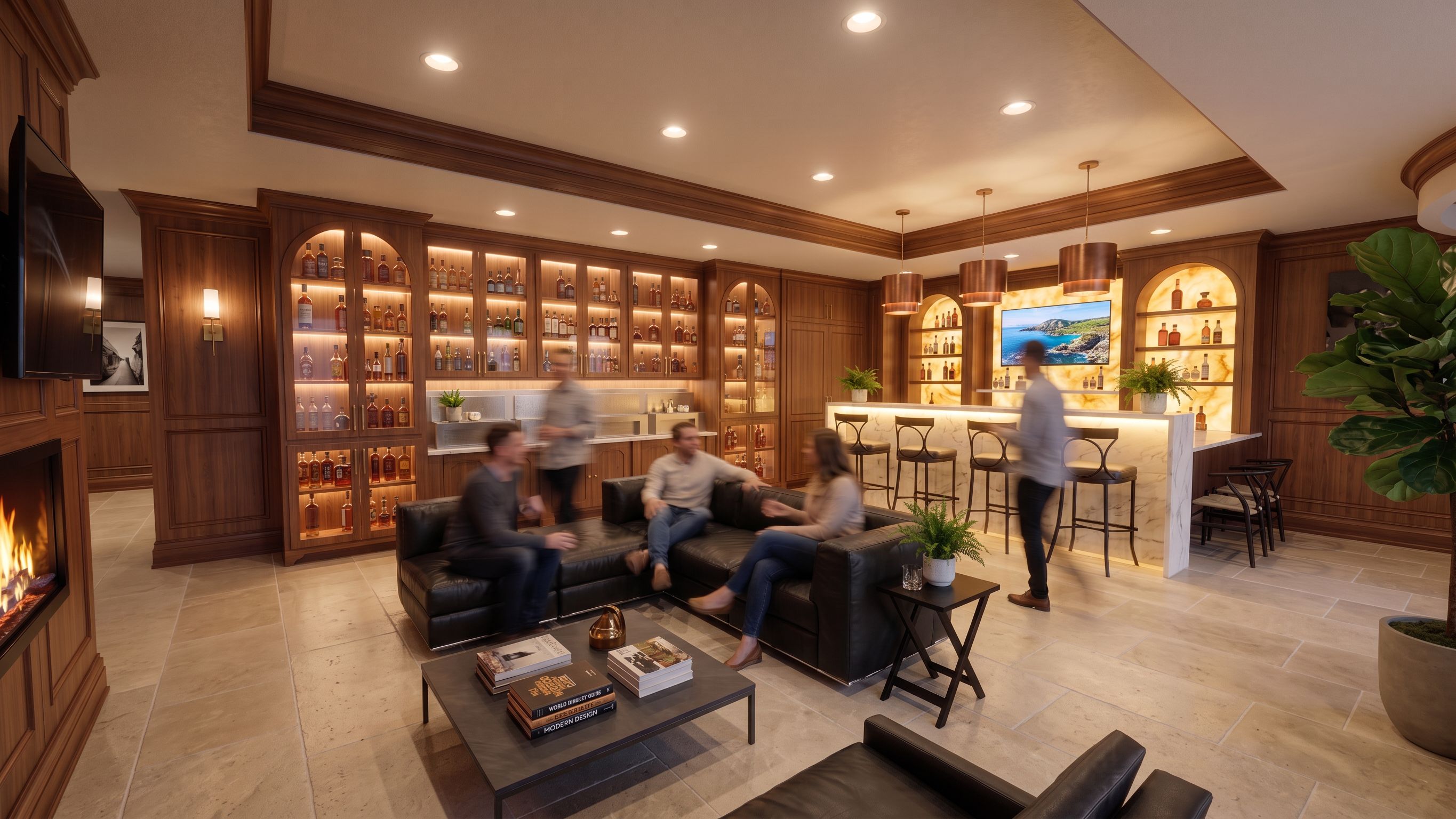 PromptFlooring to be beige limestone. Make ceiling flat with down lighting. underlight high bar counter counter. change pendants to drums of copper. Place flat screen on wall above frire place. Insert a picture on TV behind bar., keep exact camera angle