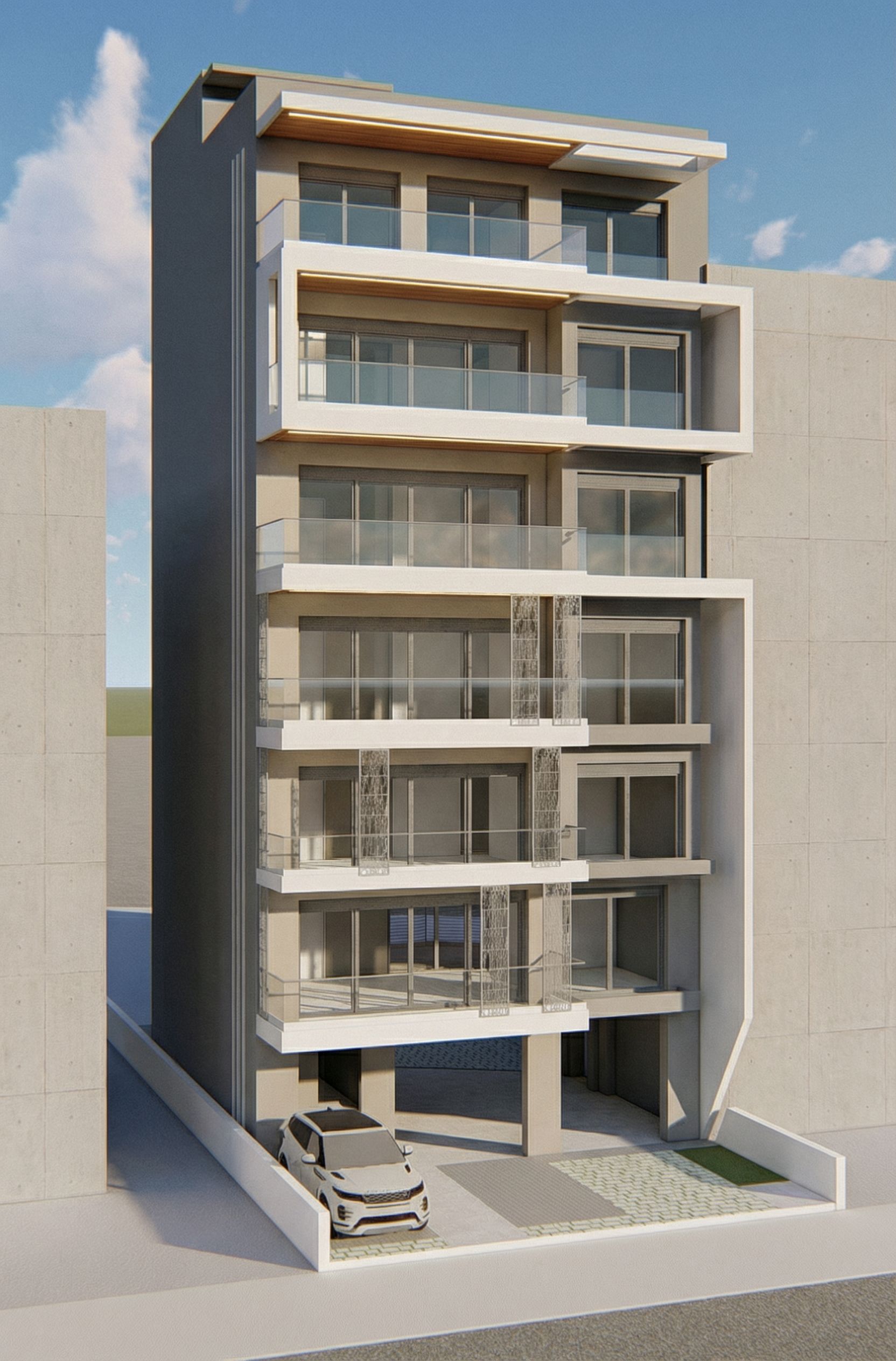 PromptPhoto of a modern apartment building featuring sleek lines and contemporary balconies. Emphasize , expansive glass windows, and wooden tops of balcony accents. Capture natural sunlight enhancing the architectural details, with soft shadows cast by the balconies. Basic color ral 7006 and some beige details with white balconies. Dont change the building. No trees .Do light grey the right and left box. Grammical Light in the wooden balcony, keep exact camera angle