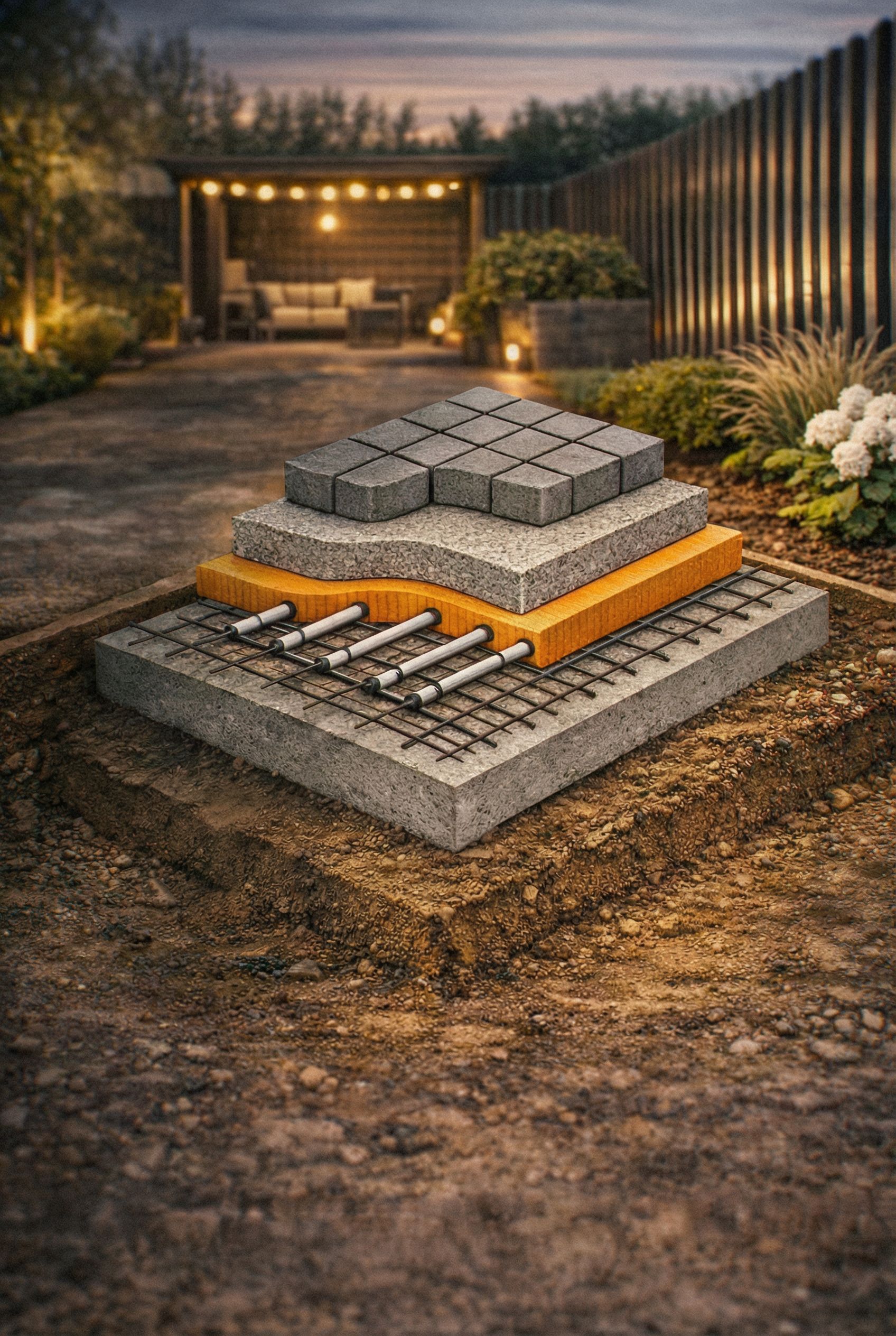 Promptобрати внимание, сетку черную (решетку) и труб, которые в оранжевом (желтом) слое сначала удали. а потом поставь их НАД оранжевым (желтым слоем), так ЧТОБЫ это было видео зрителям и слои были им понятны. то есть сверху вниз должна быть такая последовательность: плитка тротуарная, цементно-песчаная стяжка, трубопроводы системы, арматурная сетка, пенополистирол экструдированный, ж/б плита. надписей никаких на ккартинку не добавляй, keep exact camera angle