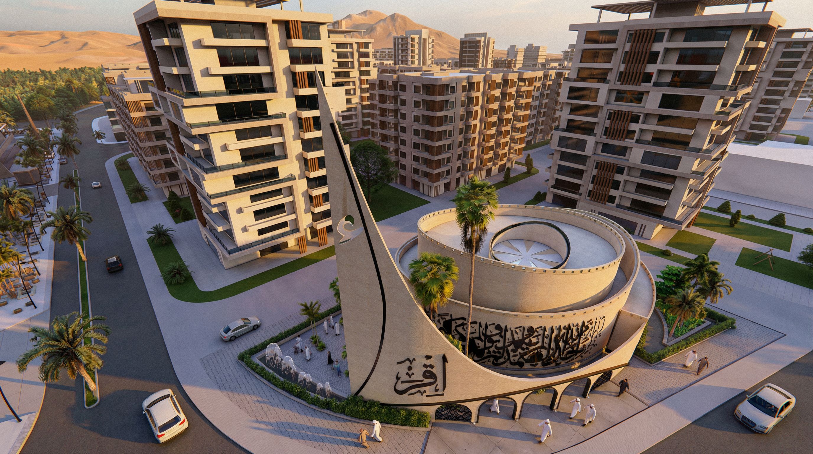 Photo of a contemporary MOSQUE, highlighted by smooth concrete surfaces and intricate calligraphy detailing on its façade. Surrounding, modern residential structures feature varying textures and materials, creating a rich urban landscape. Palm trees line the street, enhancing the OASIS feel. The scene is bathed in warm golden hour light, casting soft shadows and illuminating the building's architectural features. Captured from an aerial perspective with a wide-angle lens to encompass the harmonious integration of structure and environment, emphasizing depth and spatial relationships.