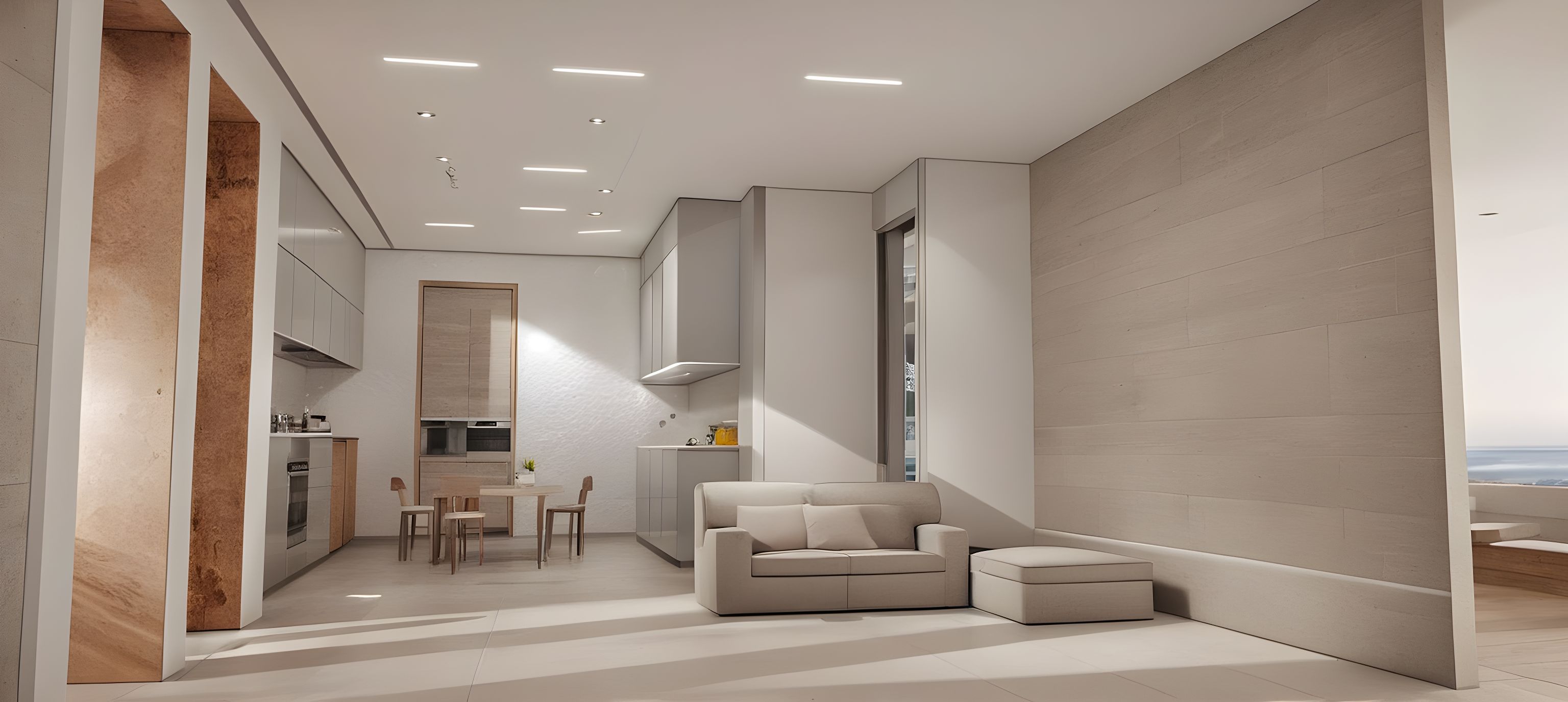 PromptA perspective view of a living room with an open space kitchen on the back. Litghing on the ceiling. Pavement in wood. White plastered walls. Minimal style furniture.