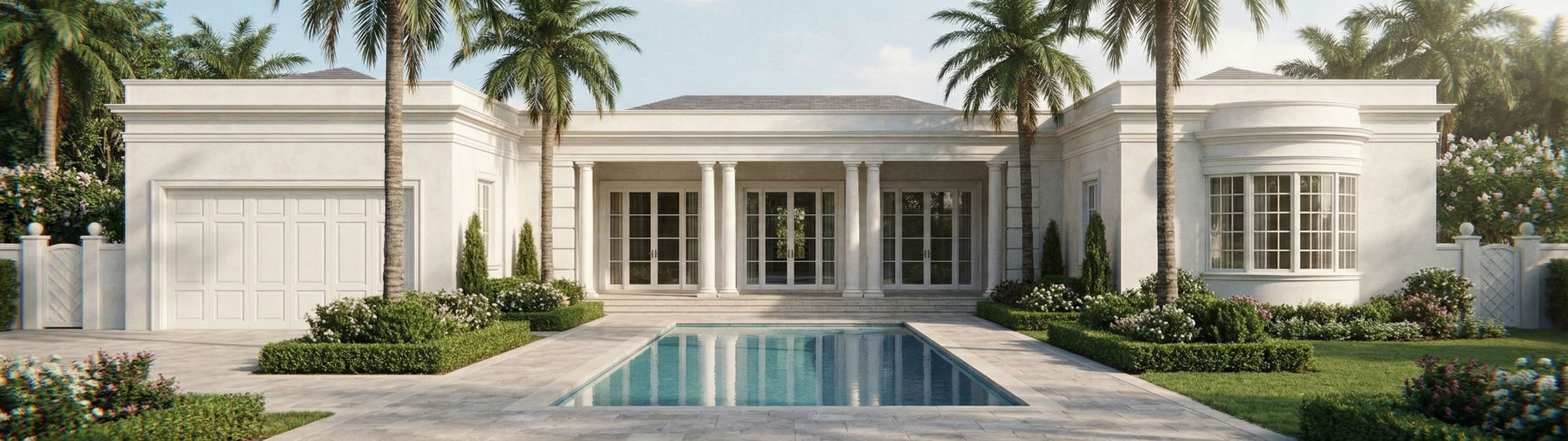 Ultra-photorealistic architectural exterior render of a Regency / Neo-Palladian style residence with strict symmetry and equal proportions throughout the massing. Facade is classically ordered, balanced, and restrained, emphasizing harmony and hierarchy rather than ornament The rear facade is perfectly symmetrical and composed of three primary sections: a dominant central mass and two identical flanking wings. The flanking wings extend 8 feet forward from the face of the columns in the center loggia, maintaining equal proportions on both sides. the flanking sides total depth is 20ft. it forms a C shape and the depth should of the flanking wings should be noticeable. the wing on the left of the image is a garage. There is a rounded bay window. This rounded bay window only protrudes 2' and should follow the neo-classical regency proportions. It should look elegant and refined. A covered loggia is centered on the rear elevation, projecting from the central mass and measuring approximately 12 feet deep. The loggia is classical and restrained, aligned with the building’s primary axis The walls of the two flanking wings subtly concave inward toward the columns of the loggia, creating a gentle inward curvature that emphasizes the central axis while remaining symmetrical and refined A centrally pool is located directly off the loggia, centered and aligned with the rear elevation. should be proportional to the rest of the house. runs parallel to the main house. refined and luxurious. simplistic in its shape. Exterior material is smooth white stucco with subtle natural variation and realistic surface texture. crisp and refined with clean profiles and delicate shadow lines. There should be a natural subtle variation between the colors of white in the architectural elements as you would find in real life. Openings are perfectly aligned vertically and horizontally, maintaining a calm, even rhythm Soft natural daylight with a slightly cinematic, dreamy atmosphere—gentle haze, softened highlights, and delicate contrast while maintaining photorealism. Realistic global illumination and true shadows. Camera at human eye level, straight-on elevation or very subtle perspective, show entirety of house. 40–45mm lens, professional architectural photography composition. Glass is clear with soft reflections and interior depth—never flat or overly glossy. Render quality comparable to high-end architectural photography, timeless, refined, and quietly cinematic. No stylization., keep exact camera angle this house is located in Palm Beach florida. This is the backyard of the house. it should look refined and luxurious. follow the architecture provided from the elevation do not alter the architectural elements drawn. create me a render of the provided elevation. this is a one story house not a two story. the overall massing should look elegant and refined. , keep exact camera angle