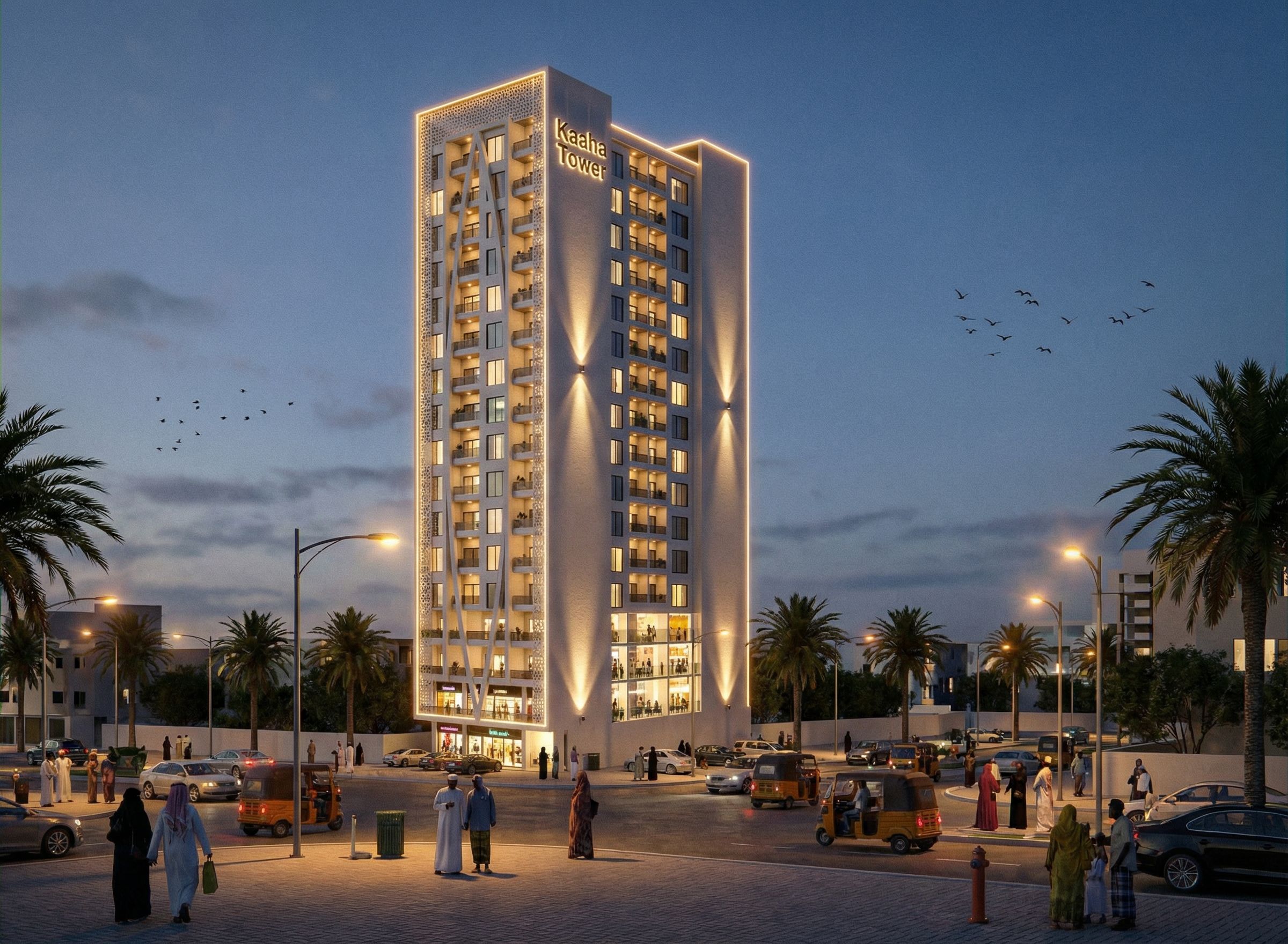 Perspective of a 16 storey building with ground and first , second and third floors as commercial spaces and fourth to sixteenth floors as apartments. Turn on the lights in the building. Use spot lights and rope lights in the building and introduce street lights.Use white wall master on the building and introduce people of Somali origin on the street. Introduce some birds in the sky and the environment a commercial building in Mogadishu Somalia. Use palm trees as landscaping. Introduce graphics "Kaaha Tower" on the building. , keep exact camera angle