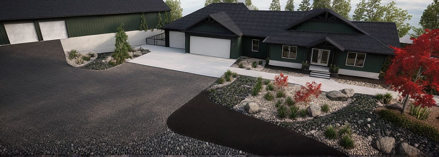 Promptdark green stucco house, black roof, white trim, white garage door, concrete walkway, river rock, dark rock paths, red maples, sandy terrain