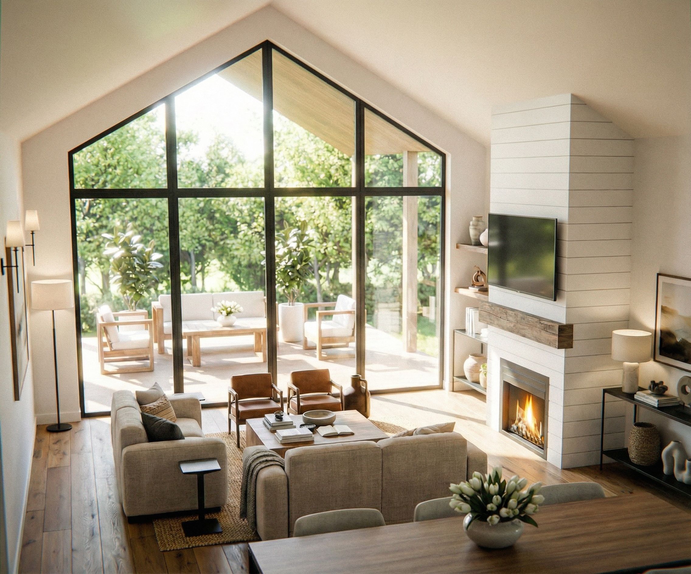 Change the shiplap to a horizontal shiplap fireplace, show a tv above the mantle, make it light bright and white feel, keep exact camera angle