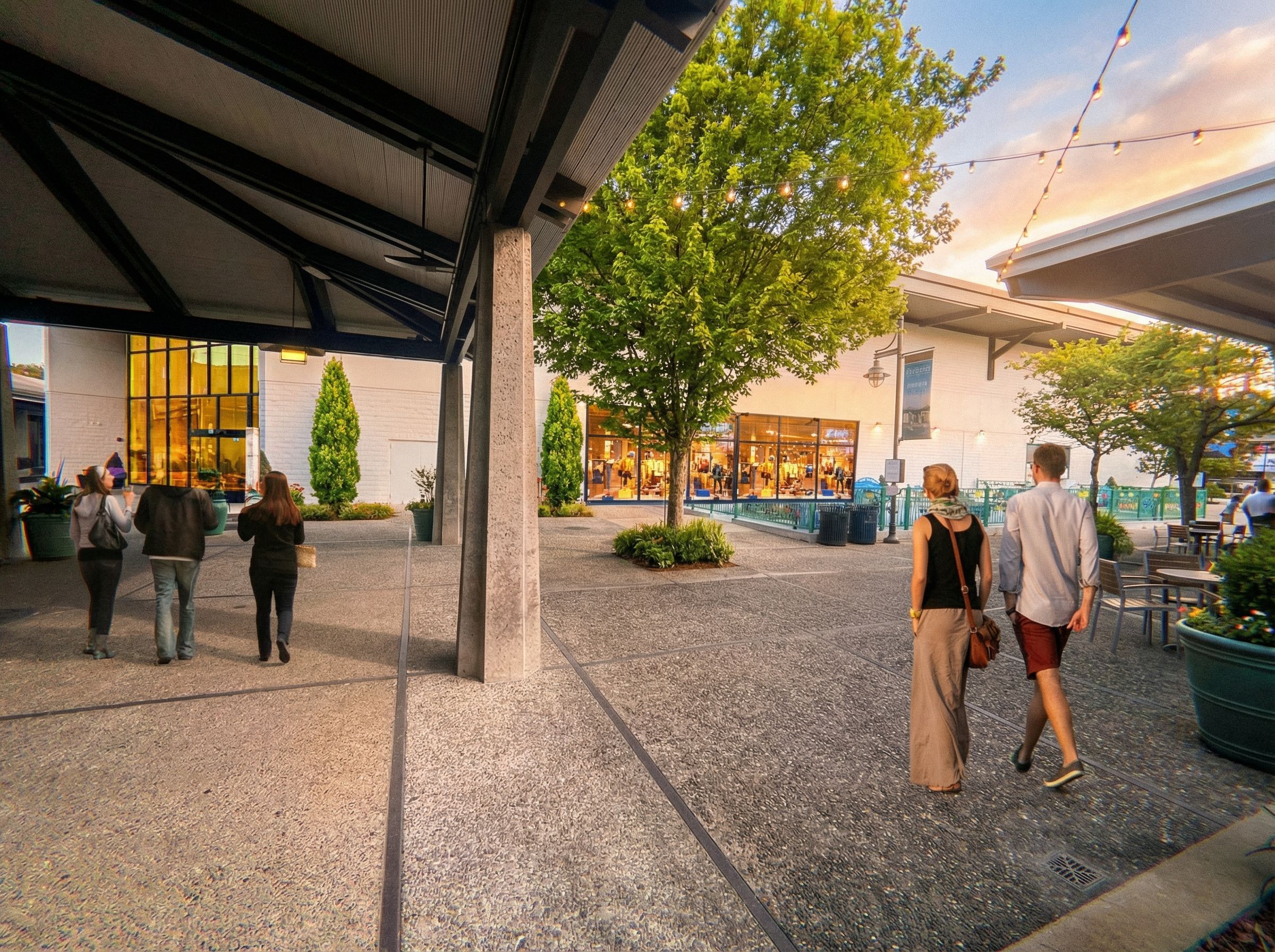 PromptPhoto of a modern commercial plaza featuring a mix of retail spaces and open walkways, showcasing large glass windows and sleek metal framing. Surrounding elements include landscaped trees, textured concrete paving, and vibrant outdoor seating areas. The scene is illuminated by soft evening light, casting gentle shadows and highlights on the surfaces. Captured from a low angle, the perspective emphasizes the dynamic interaction between pedestrians and the architecture, using a wide-angle lens to create depth and context in the urban environment., keep exact camera angle