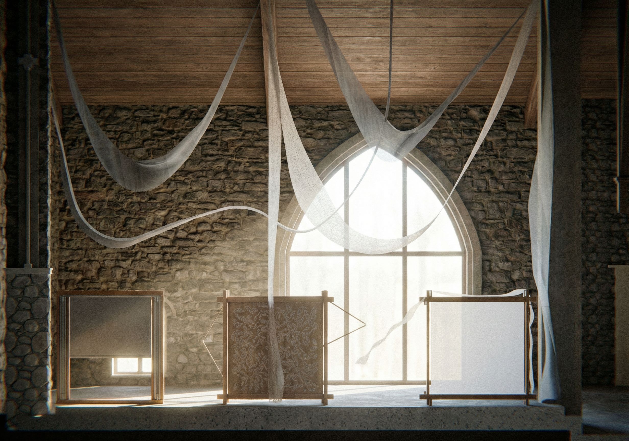 Promptrender section with light coming through window. use reference for atmosphere, keep exact camera angle