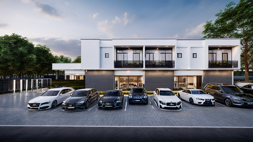 modern design of a residential apartment and a showroom, exterior wall light, ceiling lights, car park, gray white color wall paintings