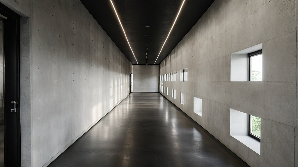 Promptit is a hallway with windows on the right wall. the walls are white concrete. it is dark