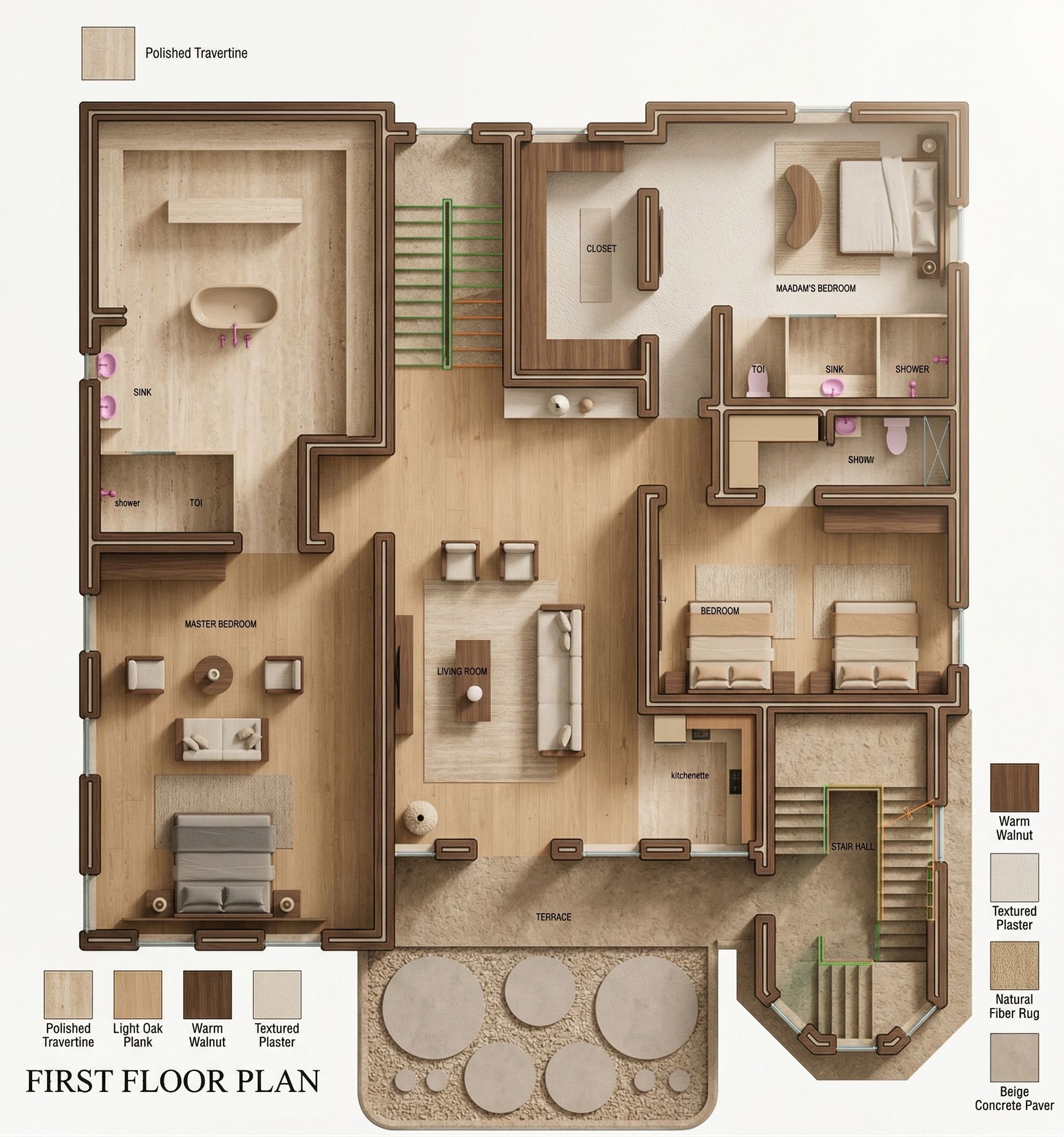 PromptGenerate a photorealistic 2D rendered floor plan in top view, showing a complete interior layout with realistic furniture, textures, finishes, clean effects,