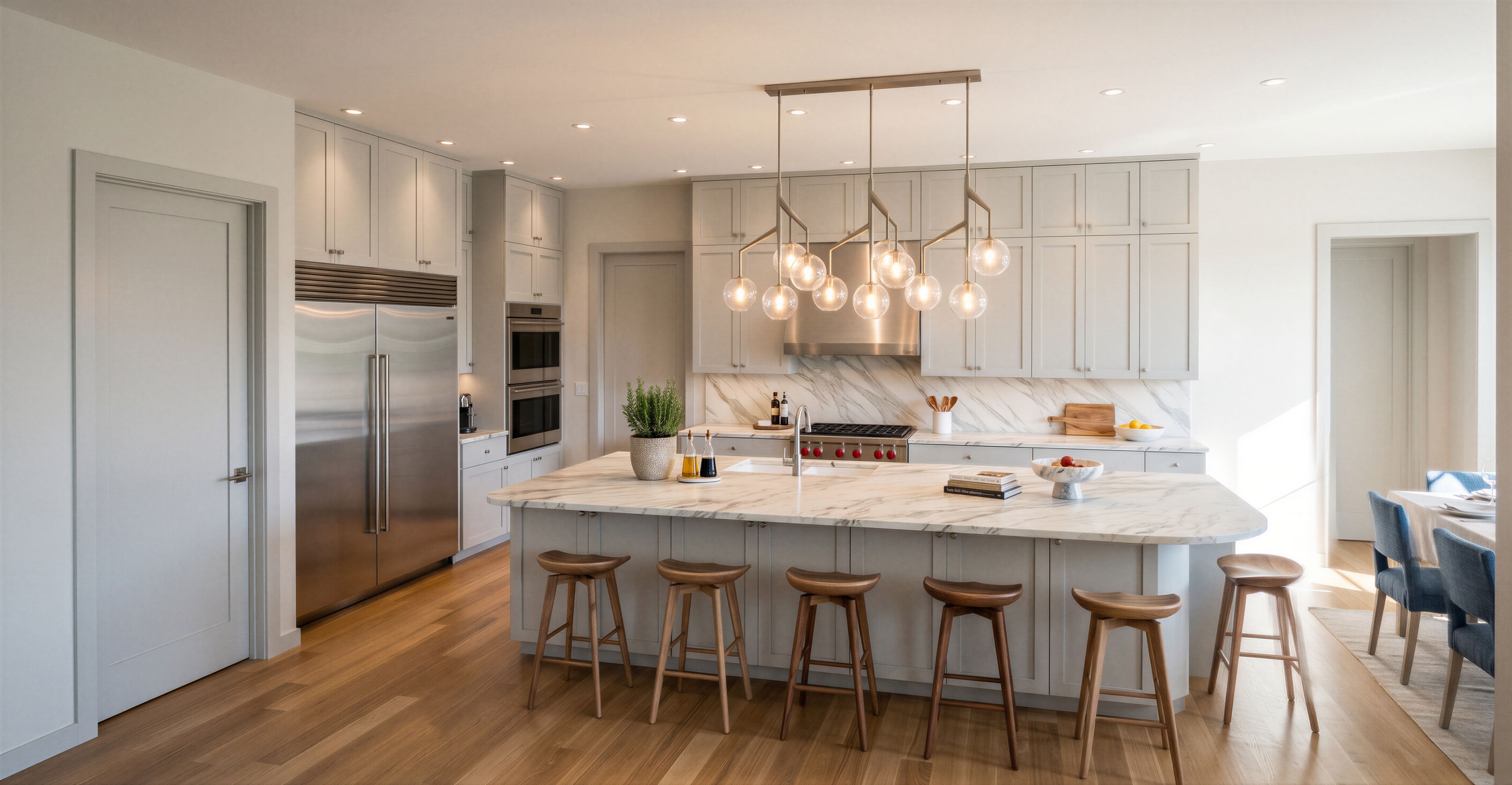 Promptmake photorealistic rendering of this kitchen, light fixtures on, bright room, do not open door, which are not opened, lower wall cabinets have no glass, keep exact camera angle
