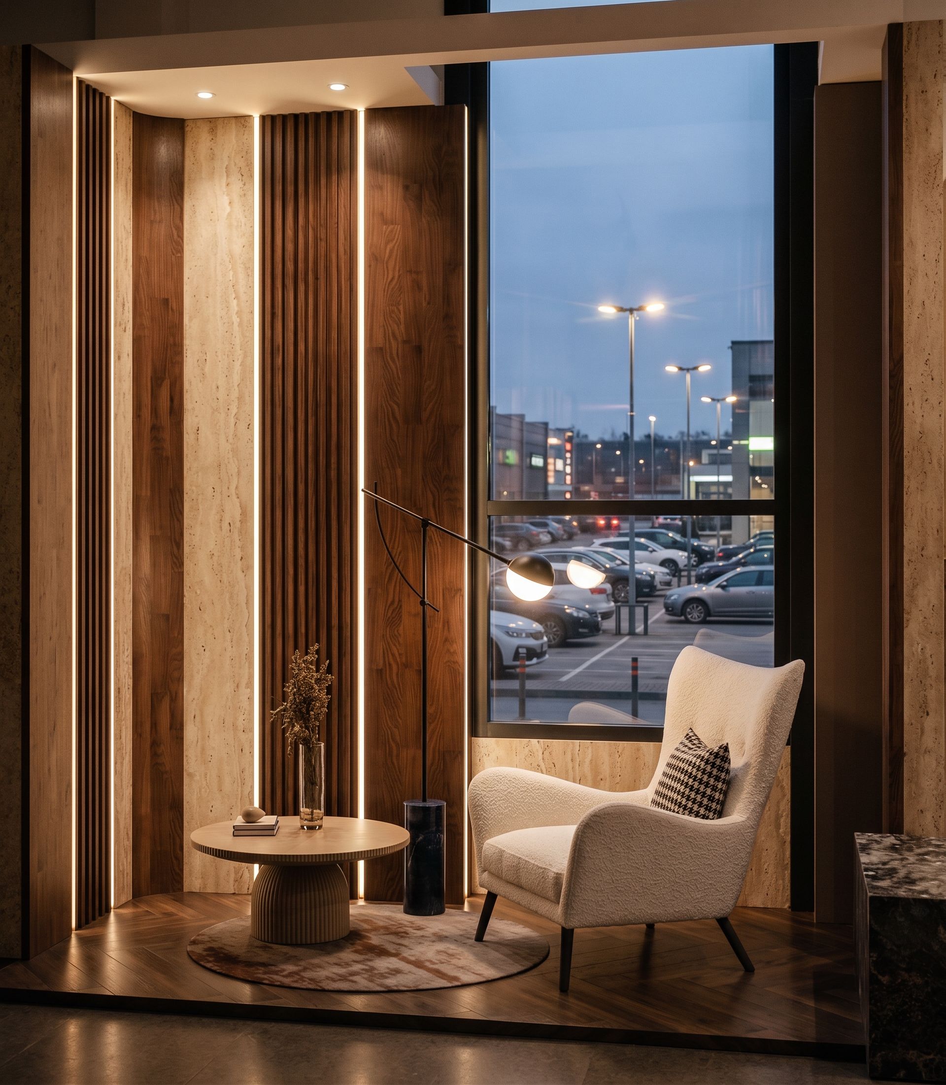 cozy atmosphere, lights on, put some vertical led stripes, outside is a parking place, keep exact camera angle