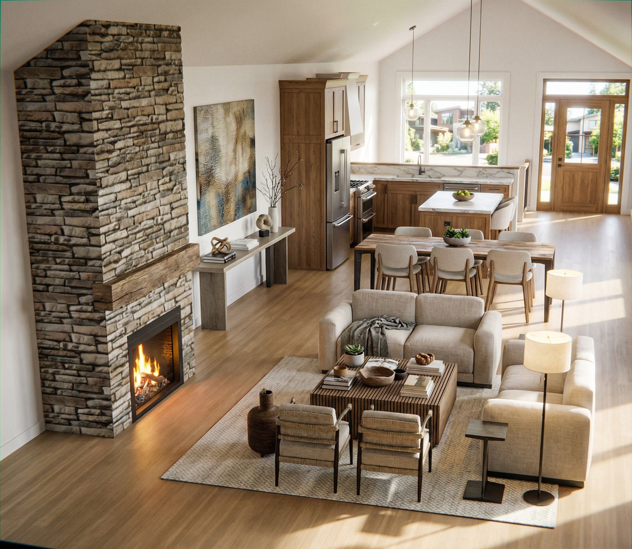Promptwood front door looking out to the street with houses, modern organic home, with elegant features, show a LARGE PAINITNG against the dining room wall, lots of decor and art, tasteful furniture, NO WINDOWS ON SIDE WALL, WAY LESS PLANTS, keep exact camera angle