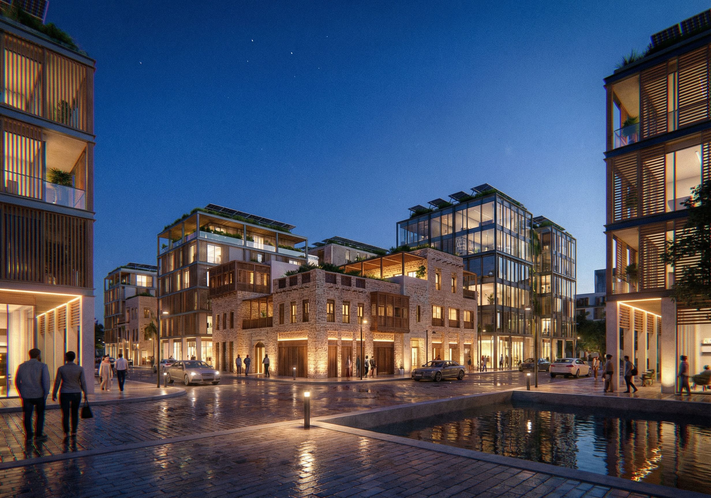 1 lane each show building at eye level showing a combination of Authentic and contemporary mixed use sustainable buildings. set in Bahrain