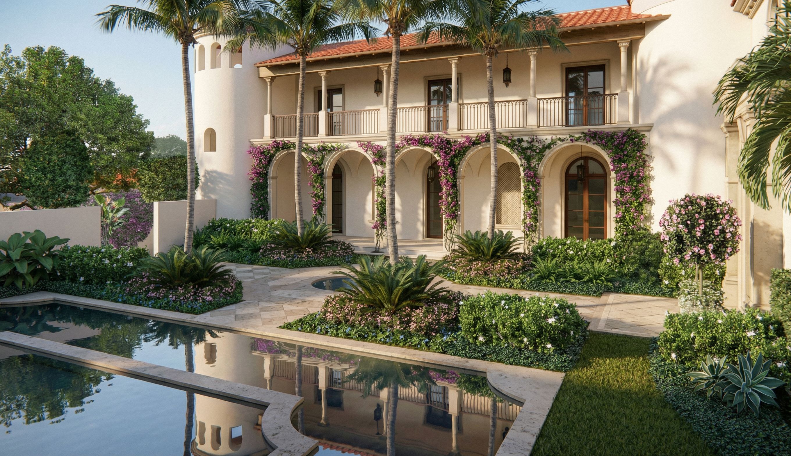 Ultra photorealistic architectural rendering of a Mediterranean Revival residence in Palm Beach, Florida using the uploaded image as the exact visual reference for both the architecture and the landscape layout. The uploaded image defines the exact building massing, architectural elements, hardscape layout, reflection pool, planting bed locations, lawn areas, palm placement, vine locations, hedge locations, and overall garden composition. Preserve all of these exactly as shown. Do not alter the architecture in any way. Do not change the massing, roof shapes, tower geometry, arches, column spacing, balcony layout, paving layout, pool shape, window placement, door placement, or any architectural detail. Do not add new windows, doors, openings, or architectural features. Do not redesign the landscape layout. Maintain the exact placement of all planting beds, lawn areas, palms, hedges, and vines as shown in the reference image. Within the existing planting beds only, enhance the landscape to feel more luxurious, lush, layered, and professionally designed, appropriate for a multimillion dollar Palm Beach Mediterranean Revival estate. The architecture should remain a refined Palm Beach Mediterranean Revival estate with smooth hand troweled white stucco, terracotta barrel tile roofing, limestone at the primary surround, cast stone columns and trim, mahogany doors and windows, cypress soffits and beams, and limewashed cypress rafter tails. All materials should appear extremely realistic with subtle natural variation and high end detailing. The water element in the foreground is a reflection pool, not a swimming pool. Keep it shallow, minimal, and mirror-like with calm water and soft reflections of the architecture. Enhance the planting within the existing beds by adding more layered, high-end planting typical of luxury Palm Beach gardens. Use a refined composition that includes: layered hedges and clipped greenery as a base structure sculptural tropical plants such as cycads or agave as focal accents low flowering shrubs and soft groundcover for texture and color subtle seasonal color in controlled amounts soft pinks, whites, purples additional depth through varied plant heights within each bed Keep all planting elegant, curated, and intentional. Avoid randomness. Maintain the existing bougainvillea locations on the loggia and walls, but enhance them so they feel fuller, more natural, and beautifully integrated without covering or obscuring the arches or columns. Keep the existing palms in their exact locations, but enhance them to feel more mature, full, and natural with realistic canopy variation. The planting should feel richer and more established, with increased density and layering, but still controlled and refined. Avoid a jungle or resort look. This should feel like a historic Palm Beach estate garden designed with restraint and elegance. Do not expand planting beds beyond their current boundaries. Do not place plants in lawn or paved areas. Hardscape should remain exactly as shown but appear more realistic with subtle stone variation and natural wear. Lighting should resemble luxury architectural photography in Palm Beach, with warm late afternoon sunlight, soft shadows, subtle atmospheric haze, and slight Florida humidity in the air. Camera should remain similar to the original composition with a professional architectural photography perspective. The final image should look like a real photograph of a multimillion dollar Palm Beach Mediterranean Revival villa with lush, refined, professionally designed landscaping. Ultra photorealistic, elegant, layered, and natural. Do not modify architecture, massing, hardscape layout, pool shape, planting bed locations, lawn areas, or tree placement. Only enhance and enrich planting within the existing beds., keep exact camera angle