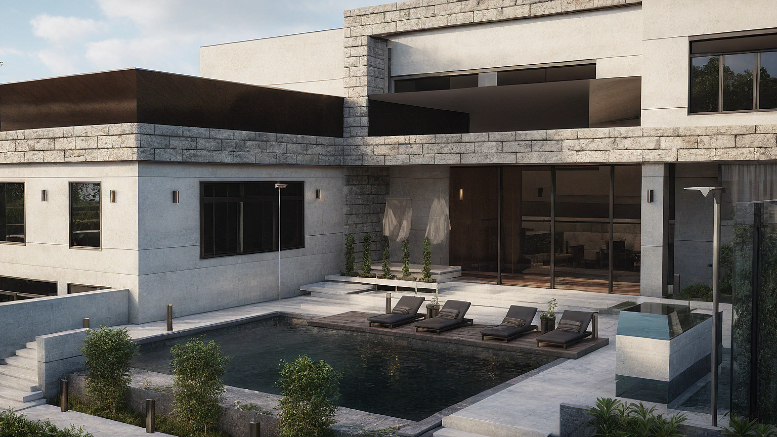 Prompt "Enhance an ultra-realistic exterior image using AI while strictly preserving the original design, lines, and composition without any distortions or alterations. Improve global illumination, refine sunlight direction, and enhance atmospheric depth. Perfect reflections on glass and water, refine displacement for detailed textures, and ensure physically accurate lighting. Maintain precise alignment of all elements, correct any imperfections, and enhance materials for a natural, high-quality finish. Optimize foliage realism, water clarity, and overall contrast while keeping the original structure and design intact."