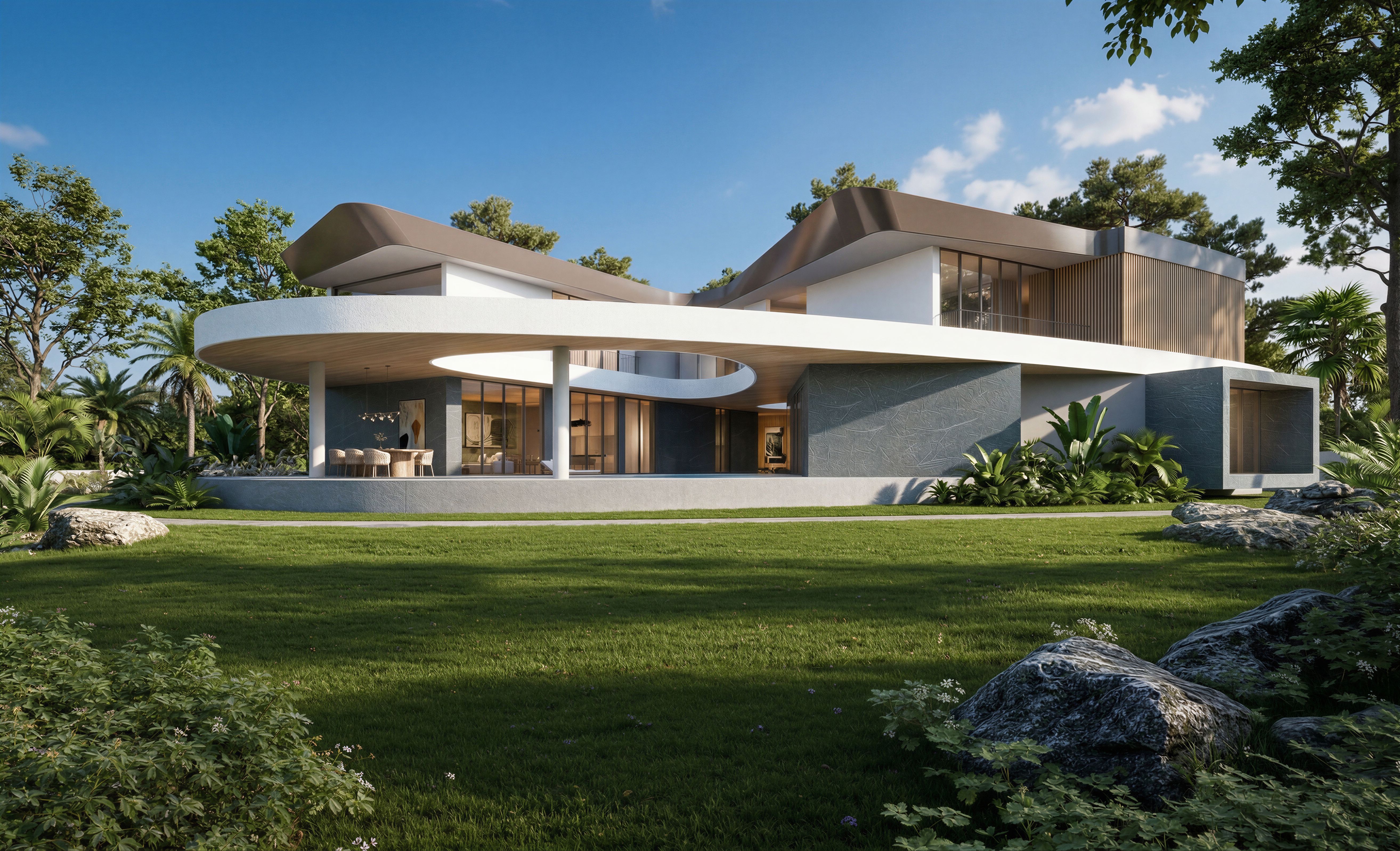 EnhancedPromptPhoto of a modern residential building, showcasing sleek curved white and gray architectural elements with large glass windows, natural wood accents and Brown-grey metallic roof edge. Surrounded by a lush green lawn, boulders, and trees, integrating with the tropical landscape. The bright afternoon sun casts soft shadows, enhancing the textures of the materials. Captured from a low angle to emphasize the building's dynamic forms and the interplay of light, using a wide-angle lens for a sense of grandeur and openness., keep exact camera angle