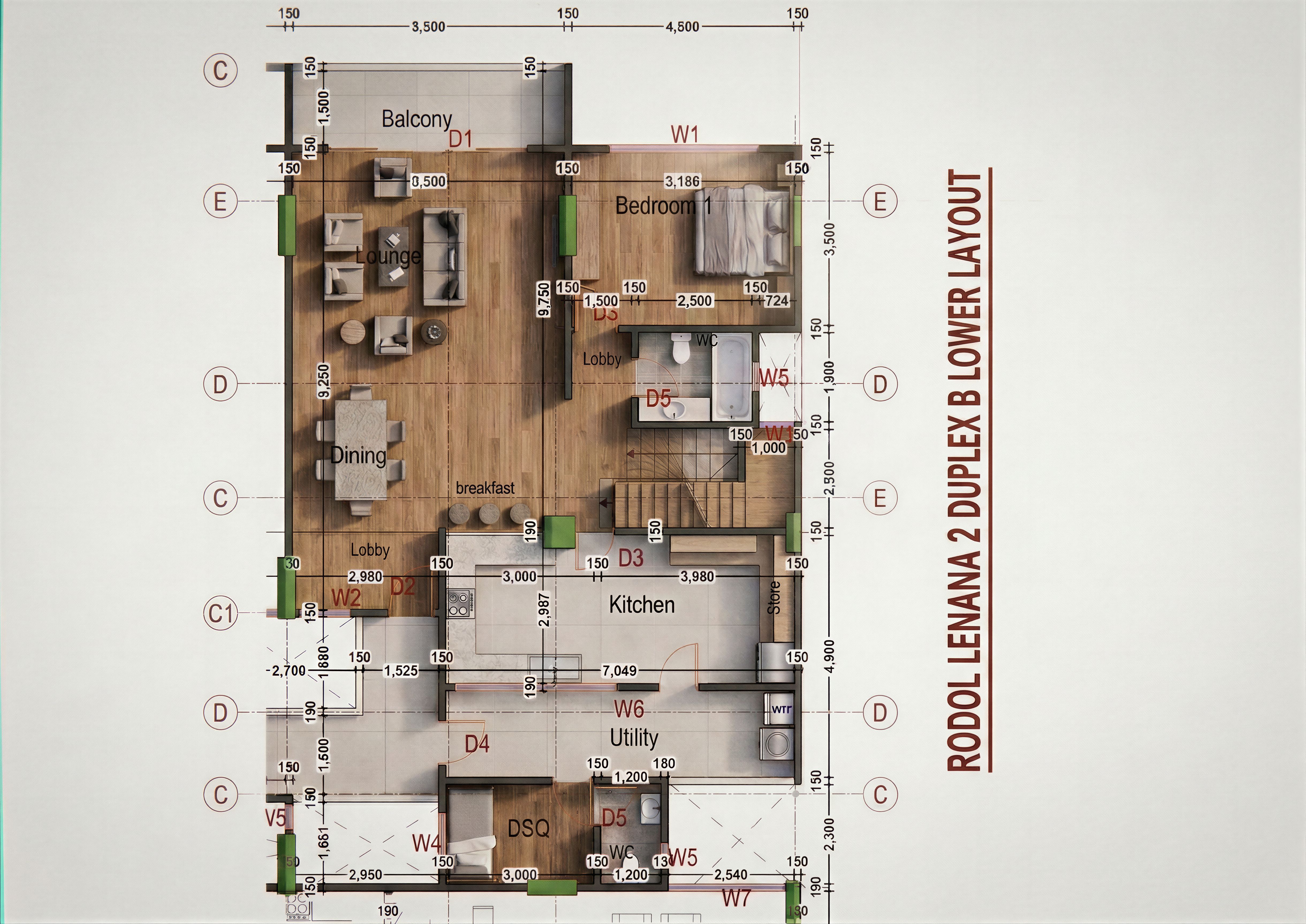 EnhancedPromptLAYOUT SHOWING THE INTERIOR OF A HIGH END APARTMENT. CLEARLY SHOW THE PARTITIONS WITH THE FLOOR FINISHES. USE TIMBER AND CERAMIC TILES ON THE FLOORS. INCLUDE A WASHER AND DRIER IN THE UTILITY AREA. INCLUDE INBUILT DOUBLE DOOR FRIDGE NEXT TO THE PANTRY. CLEARLY INDICATE THE WASHROOMS. MAKE LAYOUT HIGH RESOLUTION OF 8K. USE THE REFERENCE FILE BUT MAINTAIN ORIGINAL ANNOTATIONS AND LAYOUT DESIGN., keep exact camera angle
