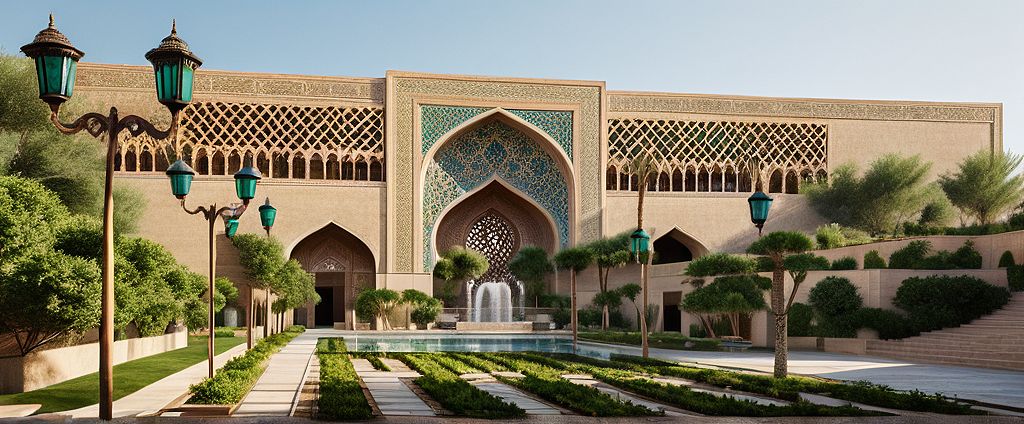 “A detailed and atmospheric rendering of the Iranian Art Garden Museum, designed in a fully traditional Persian style. Lush Persian gardens with symmetrical layout, turquoise tilework, carved wooden doors, stucco ornaments, brick arches, traditional water channels jubes, fountains, and reflective pools. Include cypress trees, roses, and Persian geometrical patterns. Warm natural light, realistic shadows, calm ambiance, and authentic Iranian architectural elements inspired by Safavid and Qajar eras. High-resolution, ultra-realistic, deep textures, intricate details, and soft daylight.”