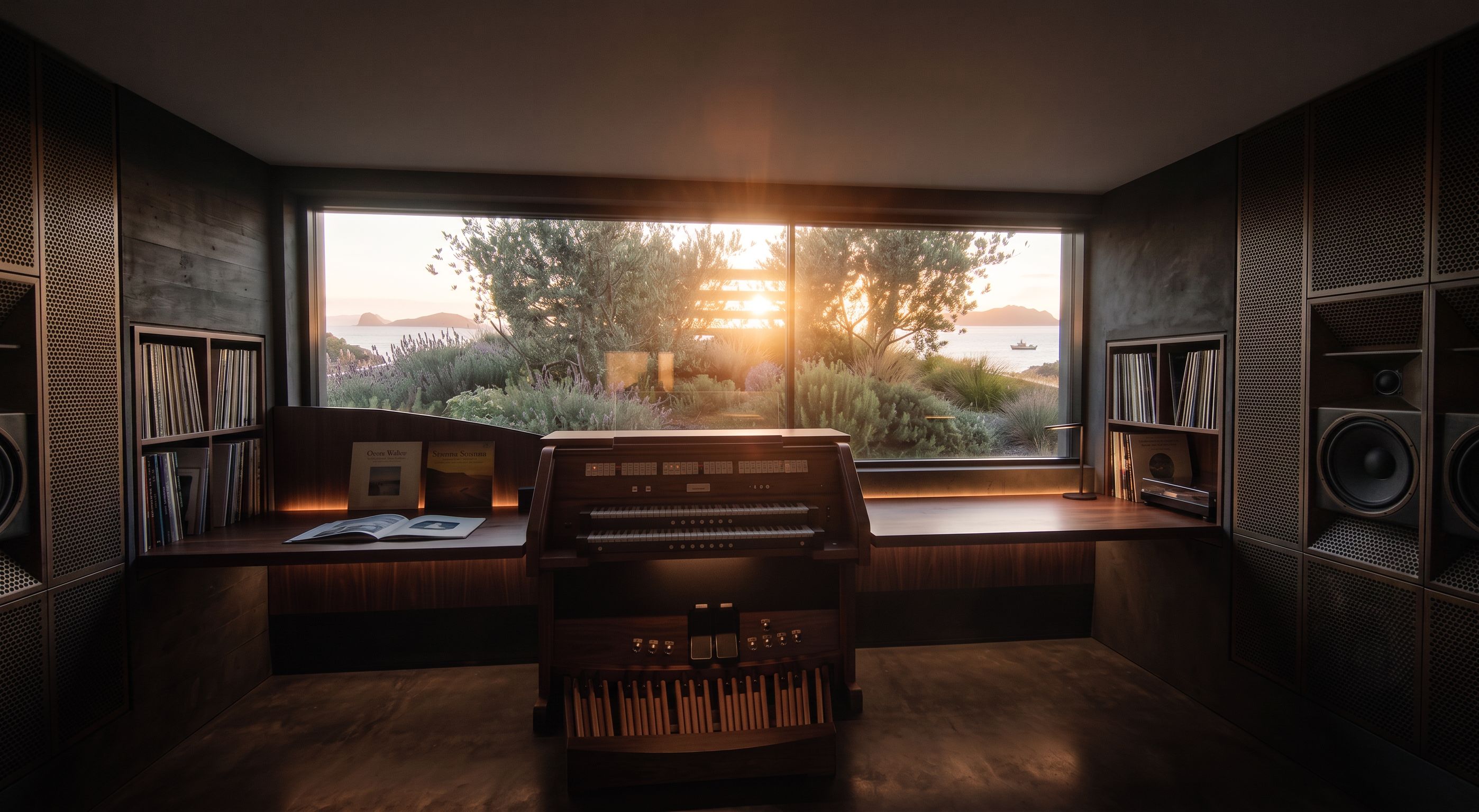 Promptintegrated gigantic loudspeakers into the walls, keep exact camera angle
