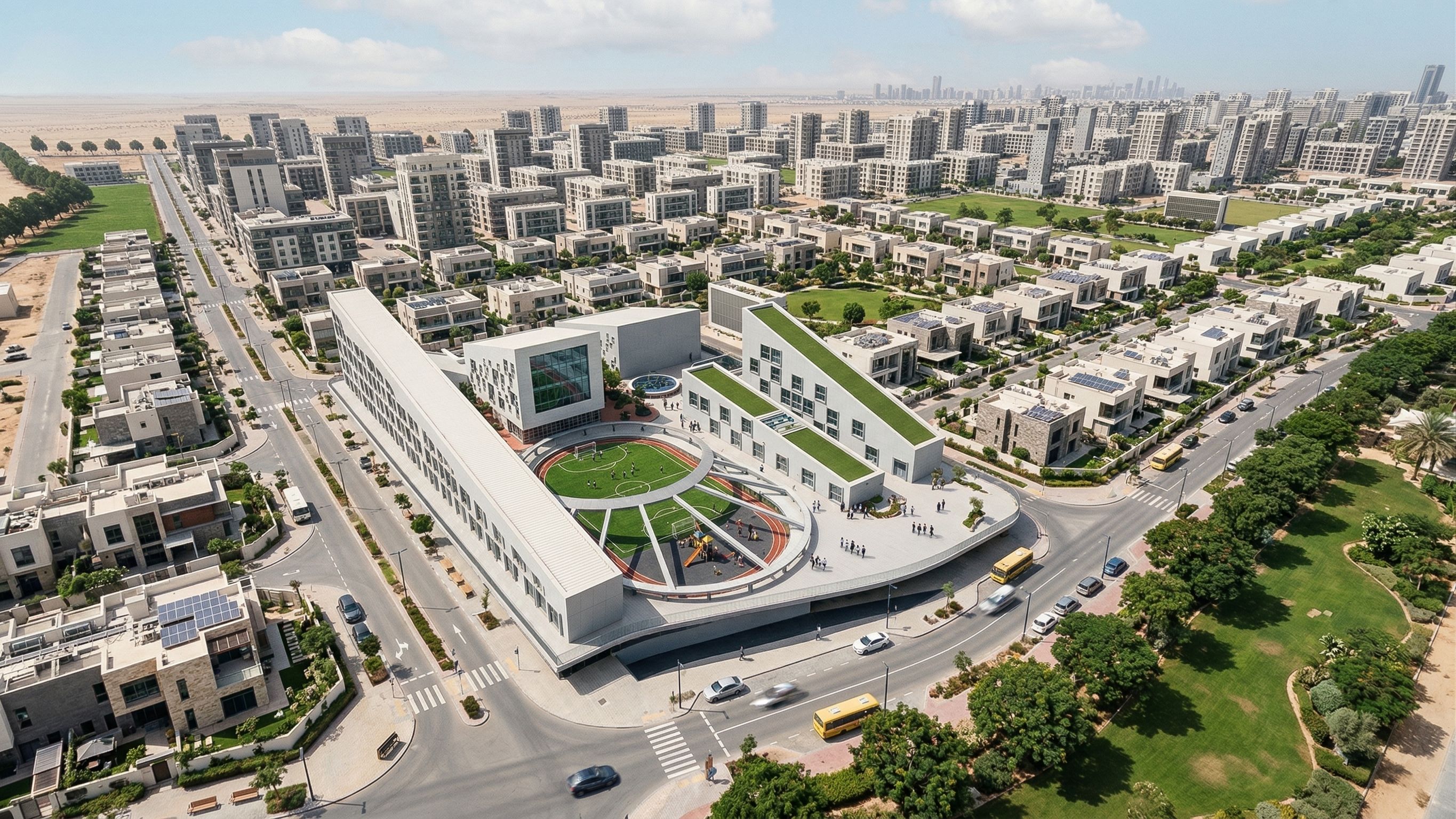 THIS IS A BIRD VIEW SCENE OF A SECONDARY SCHOOL DESIGNED IN A MODERN WAY.. AND IT IS SURROUNDED BY MODERN VILLAS AND RESIDENTIAL BUILDINGS.. COMPLETE THE WHOLE SCENE AND MAKE IT SUOER REALISTIC , keep exact camera angle