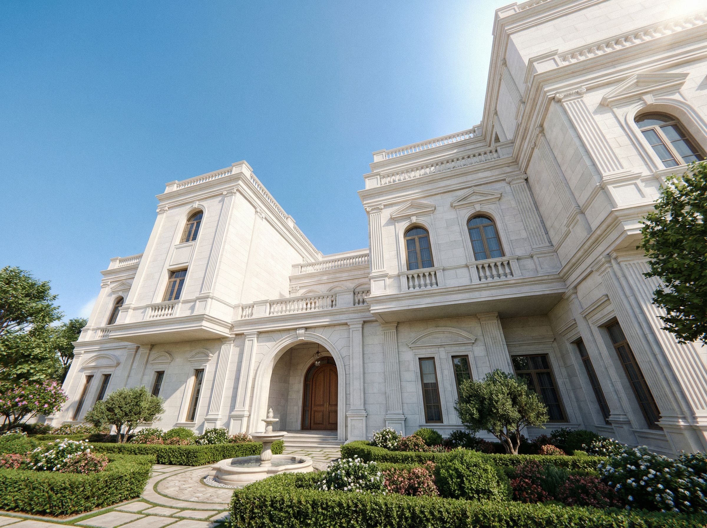 ارسم تصميم للواجهة يحمل سمات طراز الباروك دون مبالغة في الحفر على الحجر الأبيض مع تقديم مقترج لتصميم الحديقة في مقدمة الفيلا مع التركيز على دراسة المدخل الرئيسي, keep exact camera angle