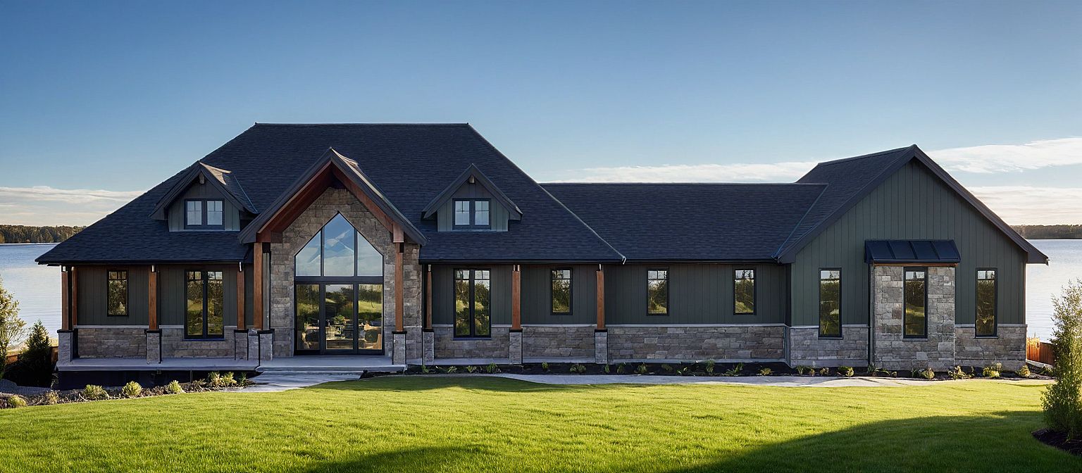 PromptPhoto of a modern residential home showcasing a blend of stone and wood materials. Emphasize the large, angular windows and striking peaked roof lines, which give the structure a contemporary, yet inviting appearance. Surrounded by a green lawn, the building is set against a clear blue sky, enhancing its architectural details. Soft natural lighting highlights the textures of the materials, while shadows create depth. Capture the scene from a frontal view, framing the home prominently, using a wide-angle lens to convey its spaciousness and connection to the landscape. PLACED ON A LAKE FRONT SETTING WITH WATER