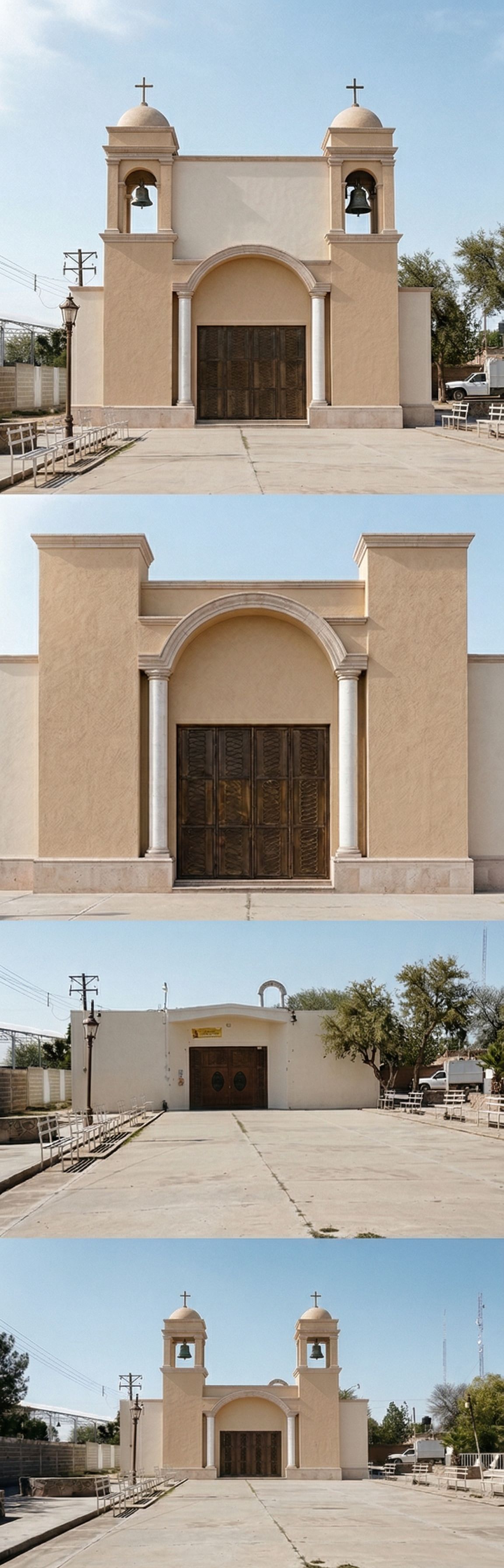 PromptPhoto of the facade of a traditional church with prominent bell towers topped with domes, made of warm beige stucco and metal gates as they are in the reference image, the moldings are of quarry stone, the columns are white, place the original image in the center of the reference image, respecting the environment in which it is located